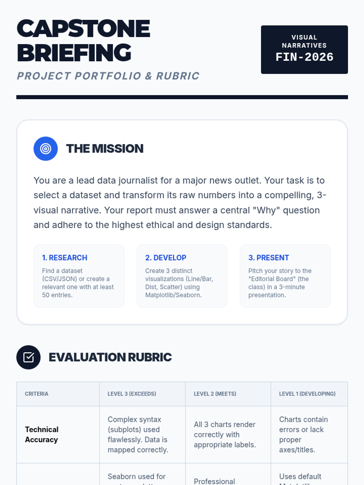 The capstone project where students act as data journalists. They synthesize all previous skills to create and present a comprehensive visual story using a dataset of their choice.