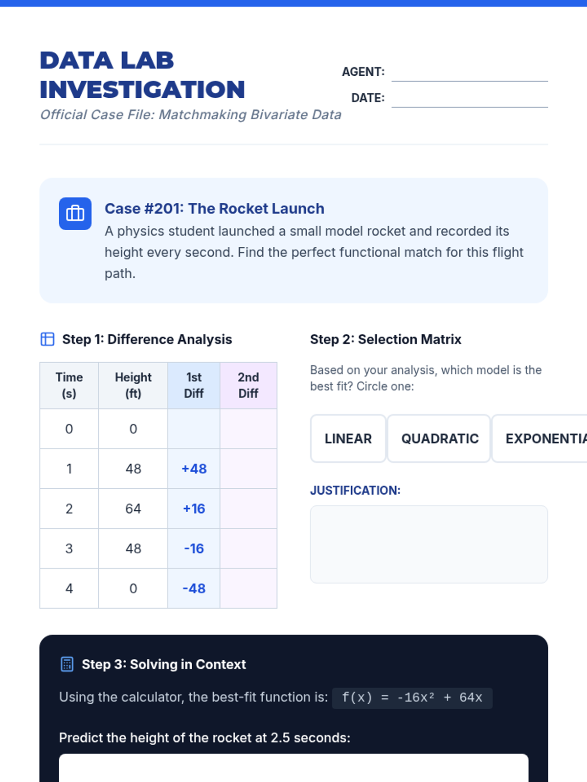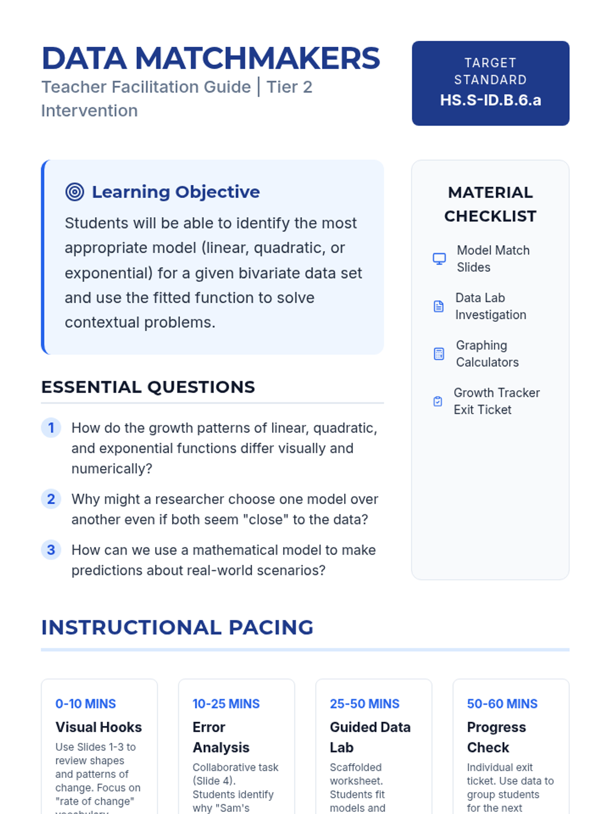 A Tier 2 intervention lesson focused on identifying and fitting linear, quadratic, and exponential models to bivariate data. Students engage in collaborative error analysis and scaffolded problem-solving to use fitted functions in context.