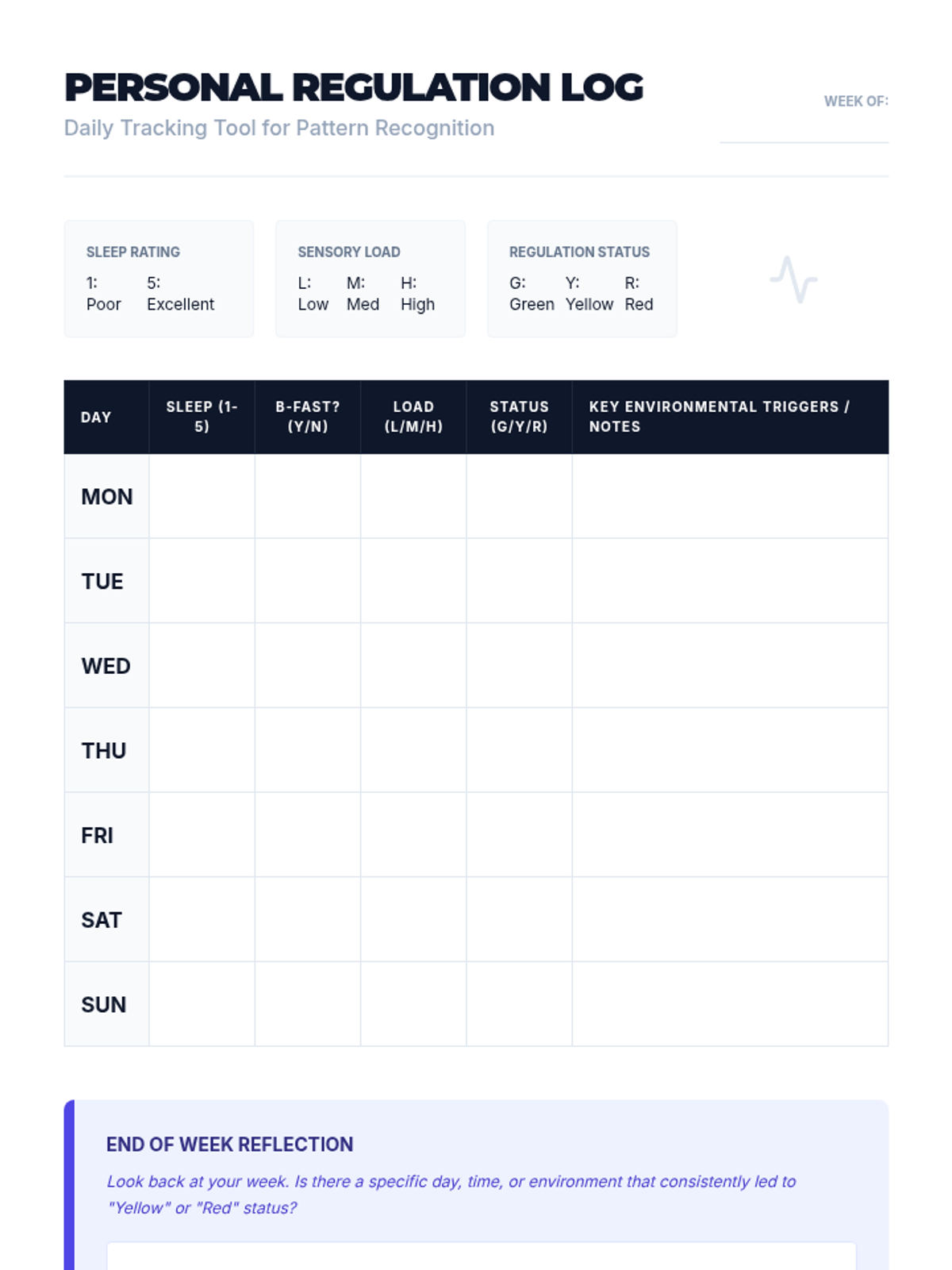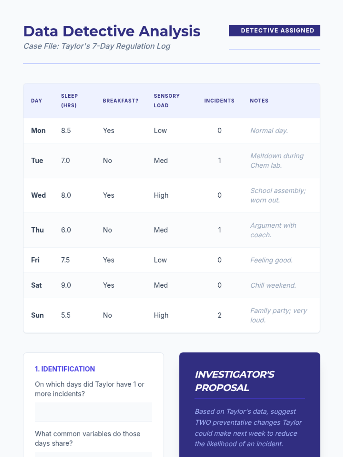 Students learn to maintain a 'regulation log' to track variables like sleep and diet, looking for correlations between environmental factors and behavioral incidents.
