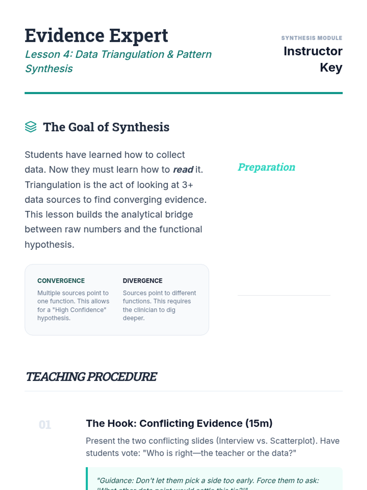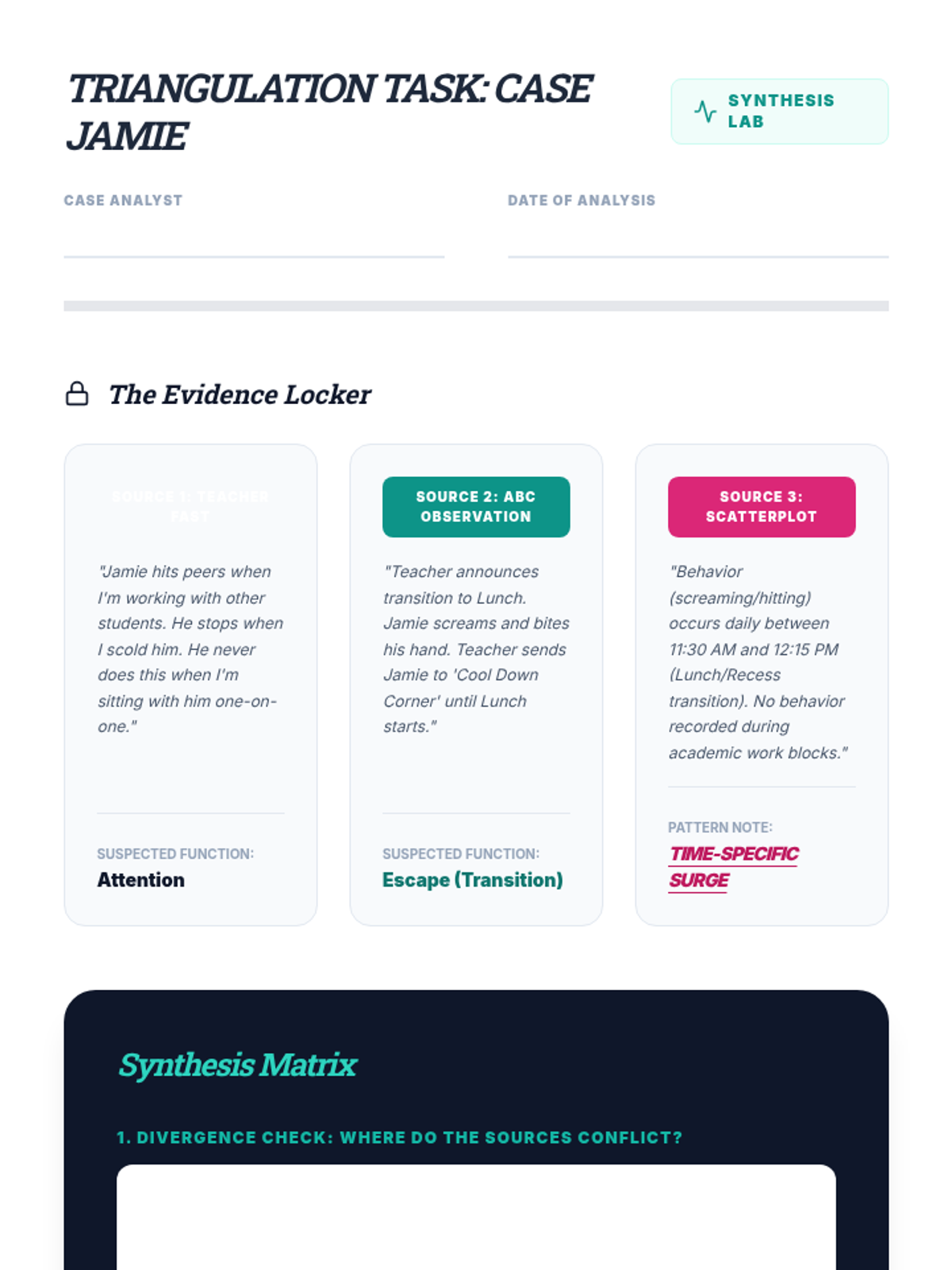 Synthesize data from multiple sources through triangulation to recognize patterns and resolve conflicting assessment results.