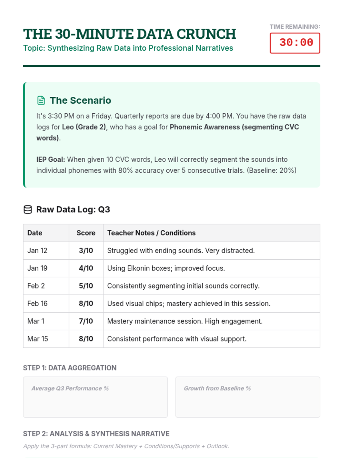 Focus on the translation of raw data sheets into formal quarterly progress reports. Students learn to aggregate data points into summary statements that align with IEP criteria and write objective, data-rich narratives.