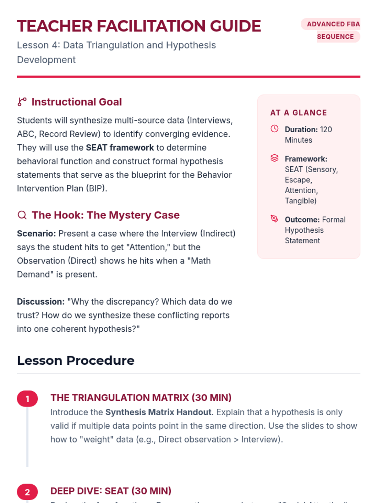 Synthesizing various data sources to identify converging evidence and constructing formal behavioral hypothesis statements using the SEAT framework.