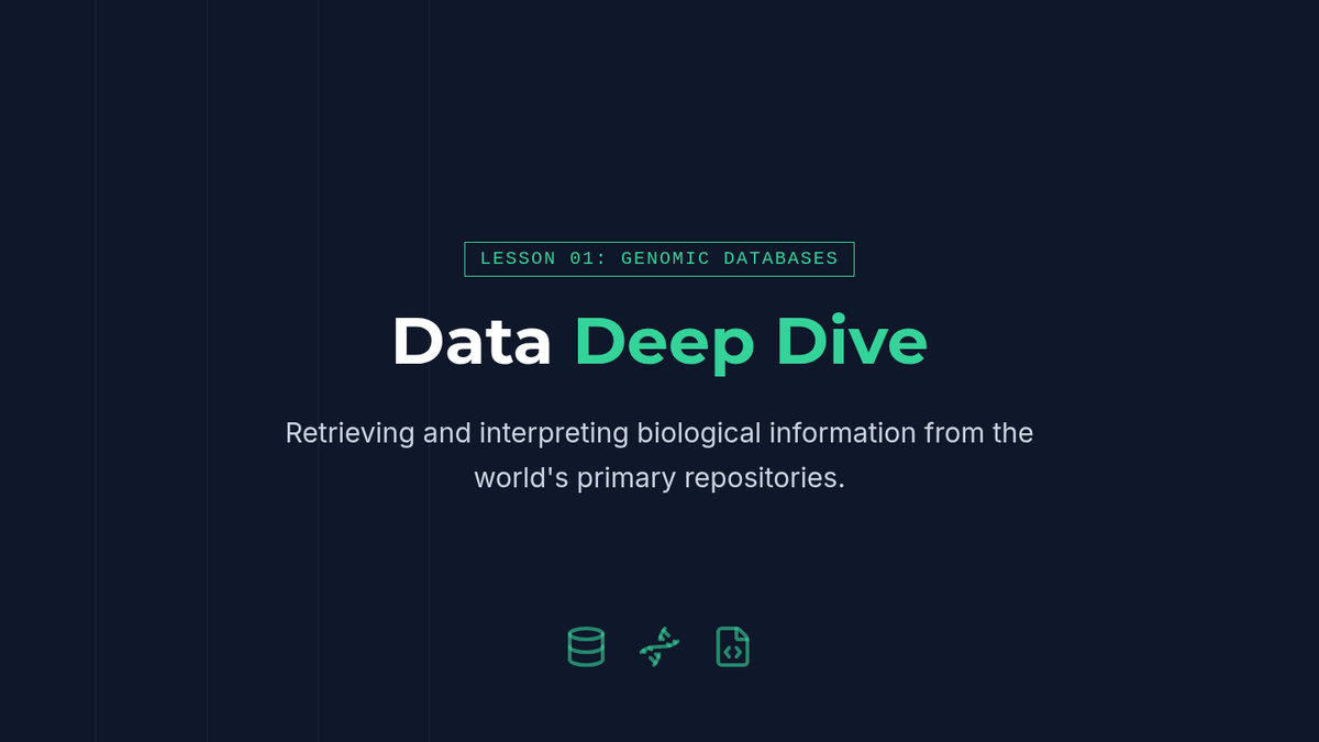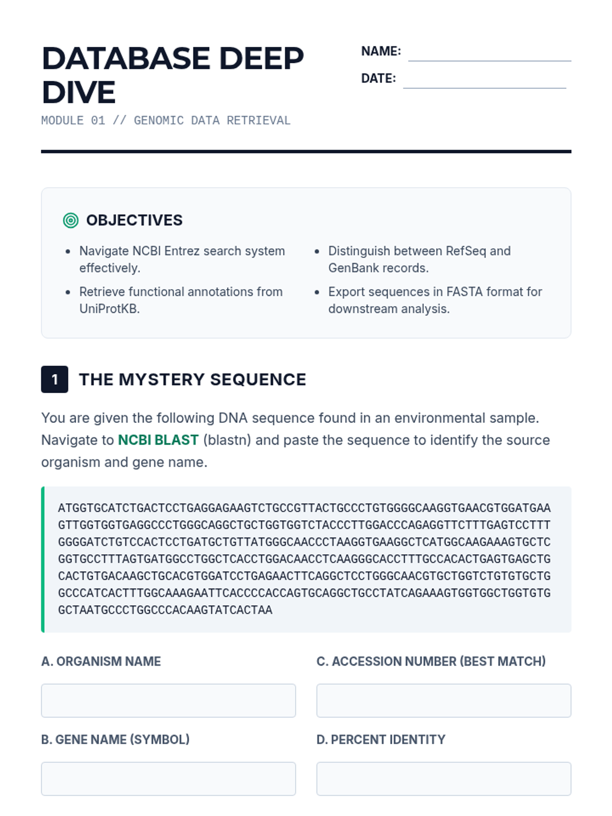 Students learn to navigate NCBI, UniProt, and Ensembl to retrieve gene and protein sequences while exploring standard file formats like FASTA and GenBank.