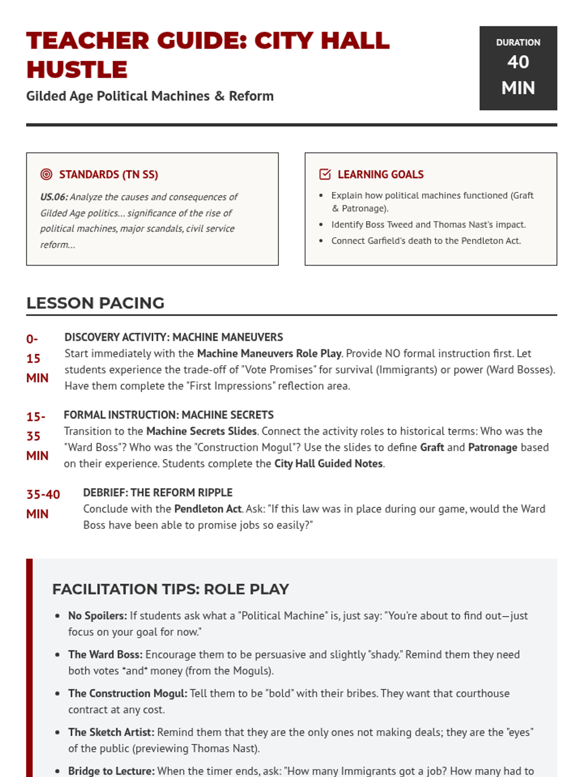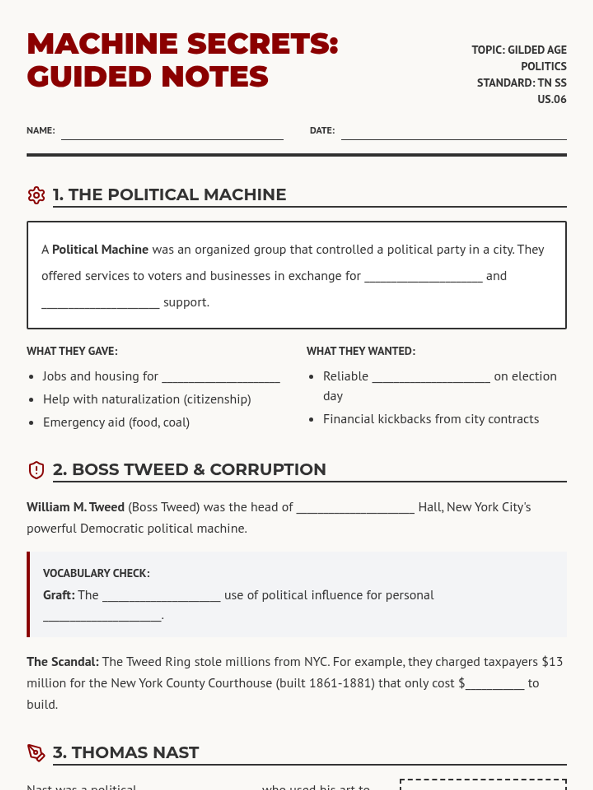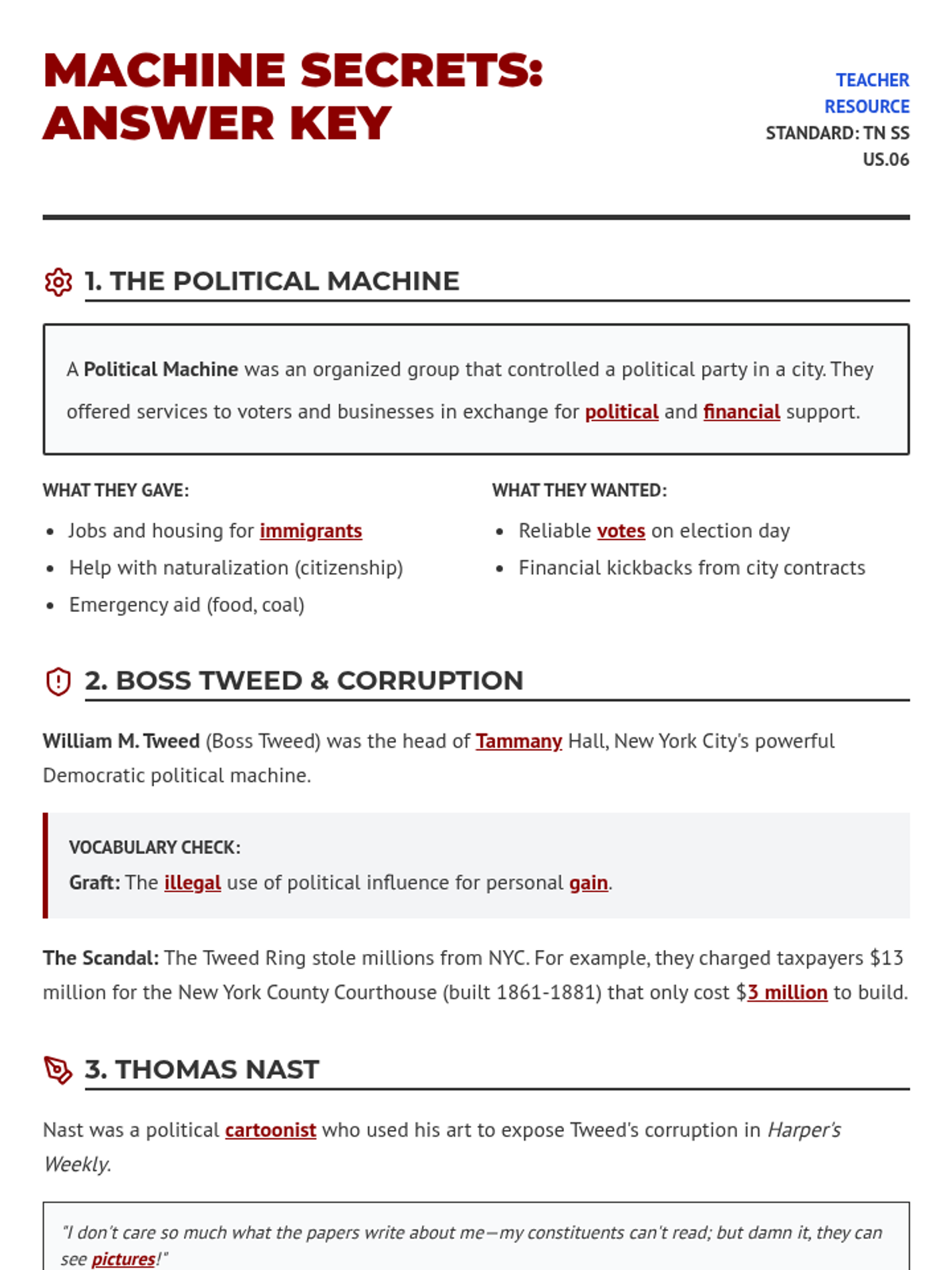 This lesson explores the rise of political machines, the spoils system, and civil service reform during the Gilded Age. Students will analyze the impact of Boss Tweed, the cartoons of Thomas Nast, and the legislative changes following President Garfield's assassination.