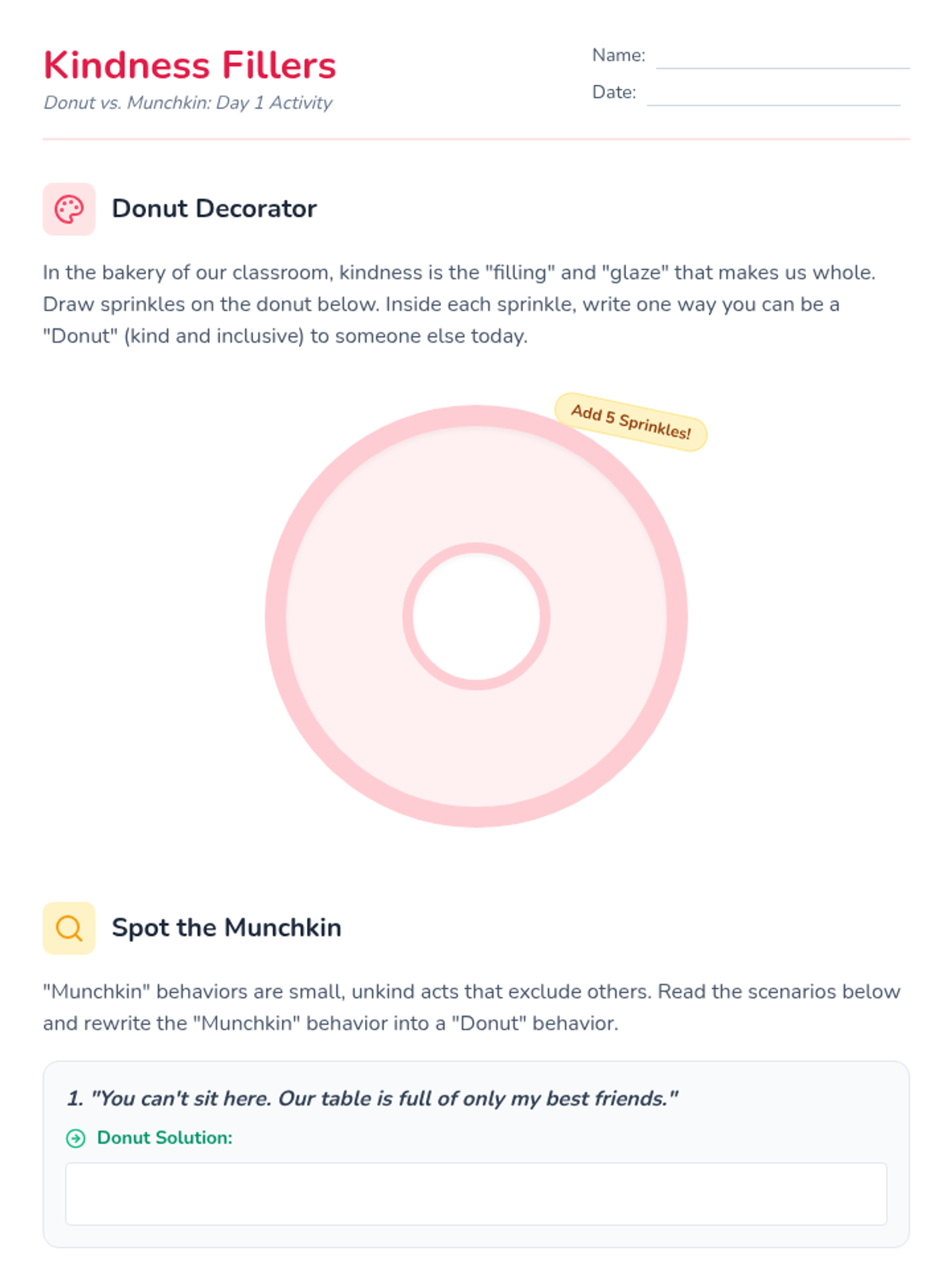Introduces the 'Donut vs. Munchkin' metaphor, where 'Donuts' represent well-rounded, kind individuals and 'Munchkins' represent small, unkind behaviors. Students learn how kindness 'fills' their emotional buckets.