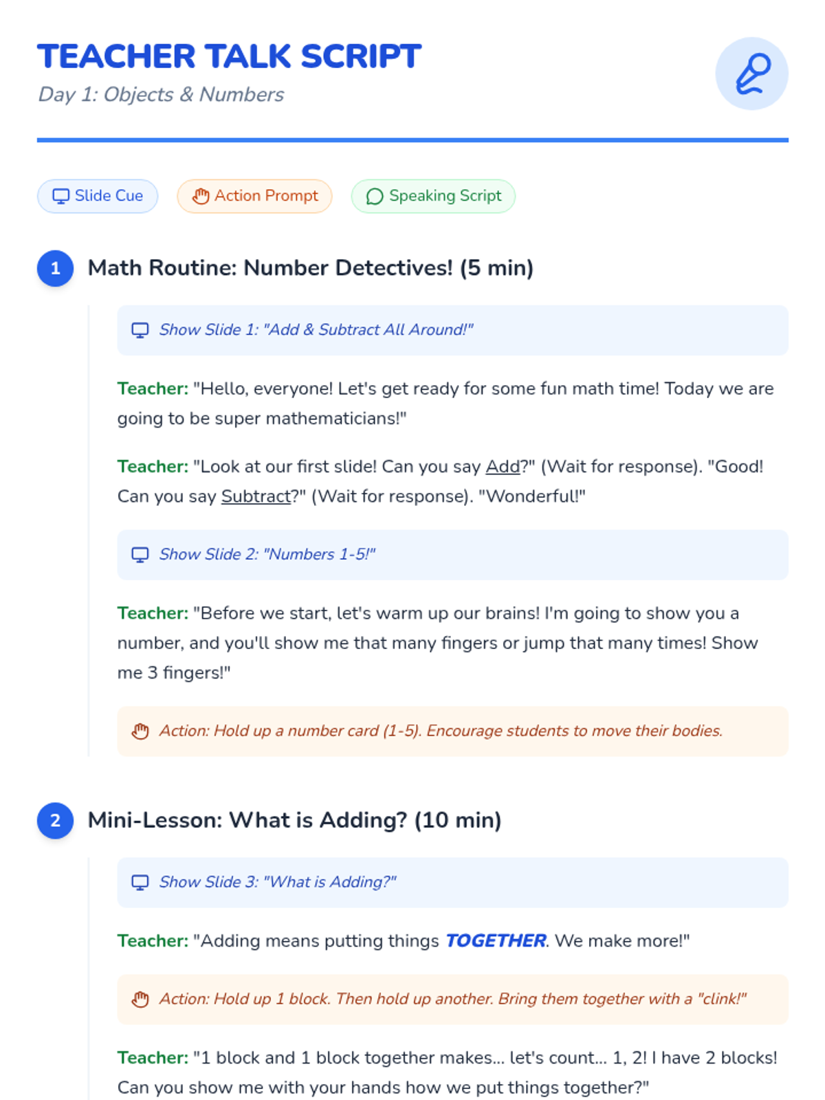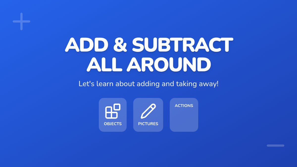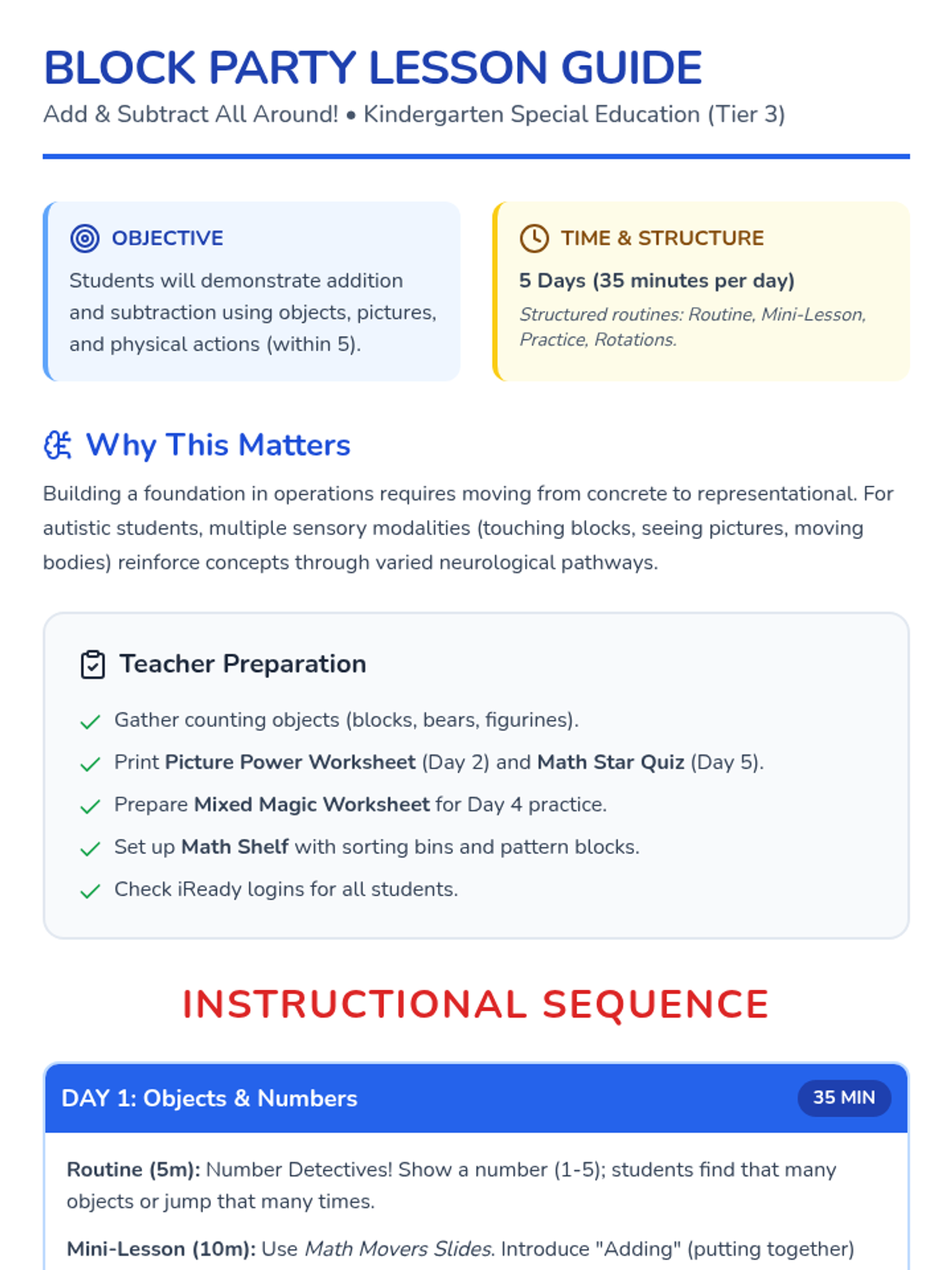 Day 1 focuses on introducing addition and subtraction using concrete objects and hands-on manipulation.