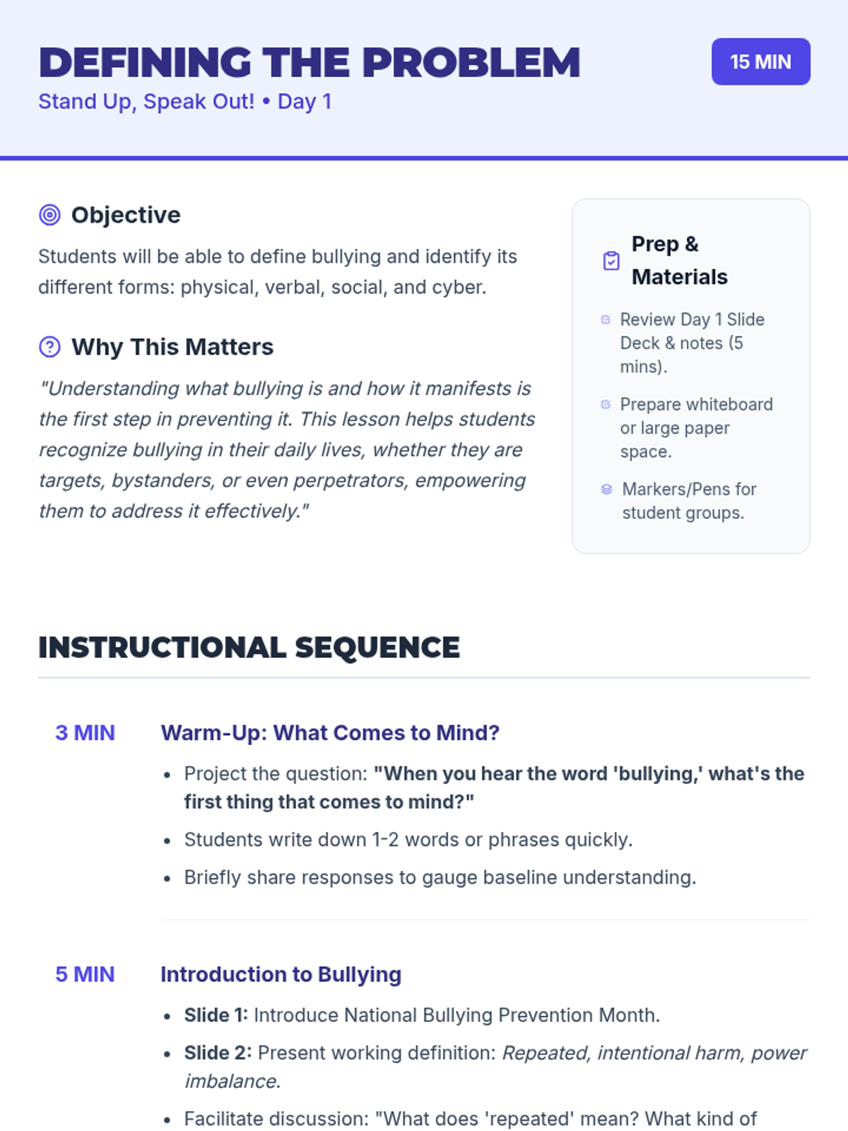 Students define bullying and identify its different forms, including physical, verbal, social, and cyberbullying.