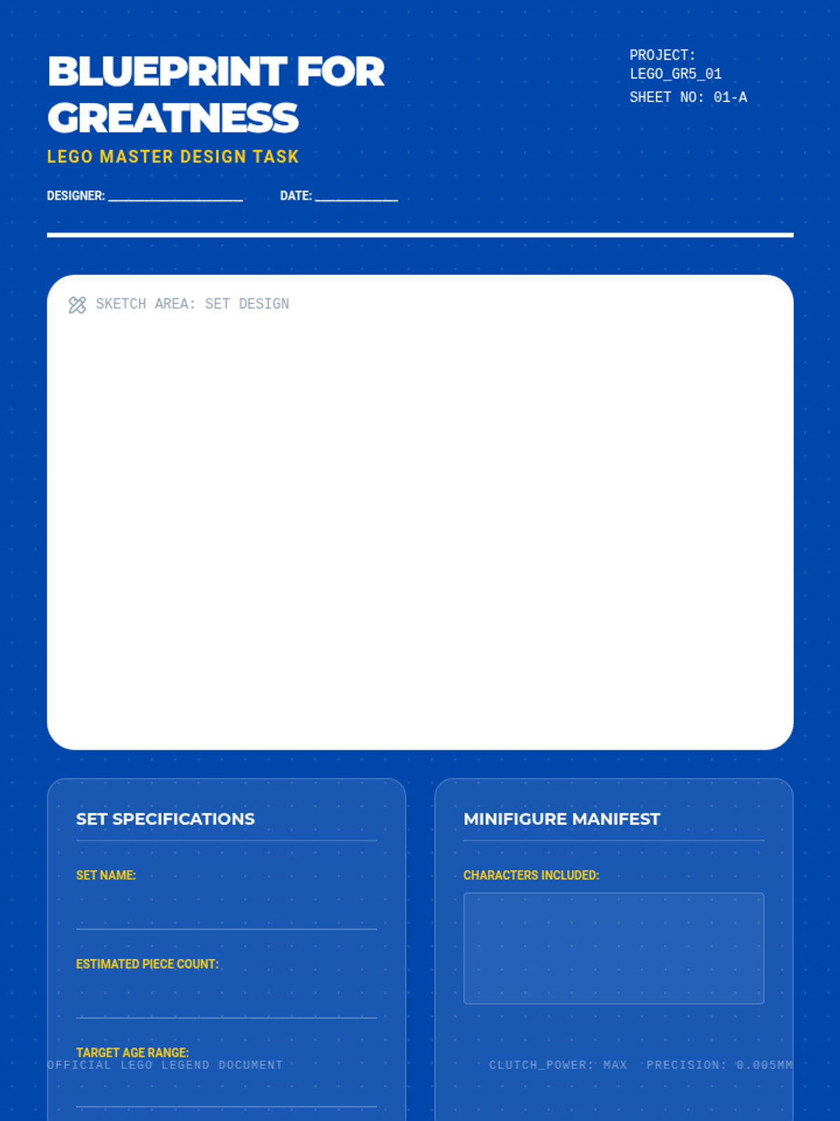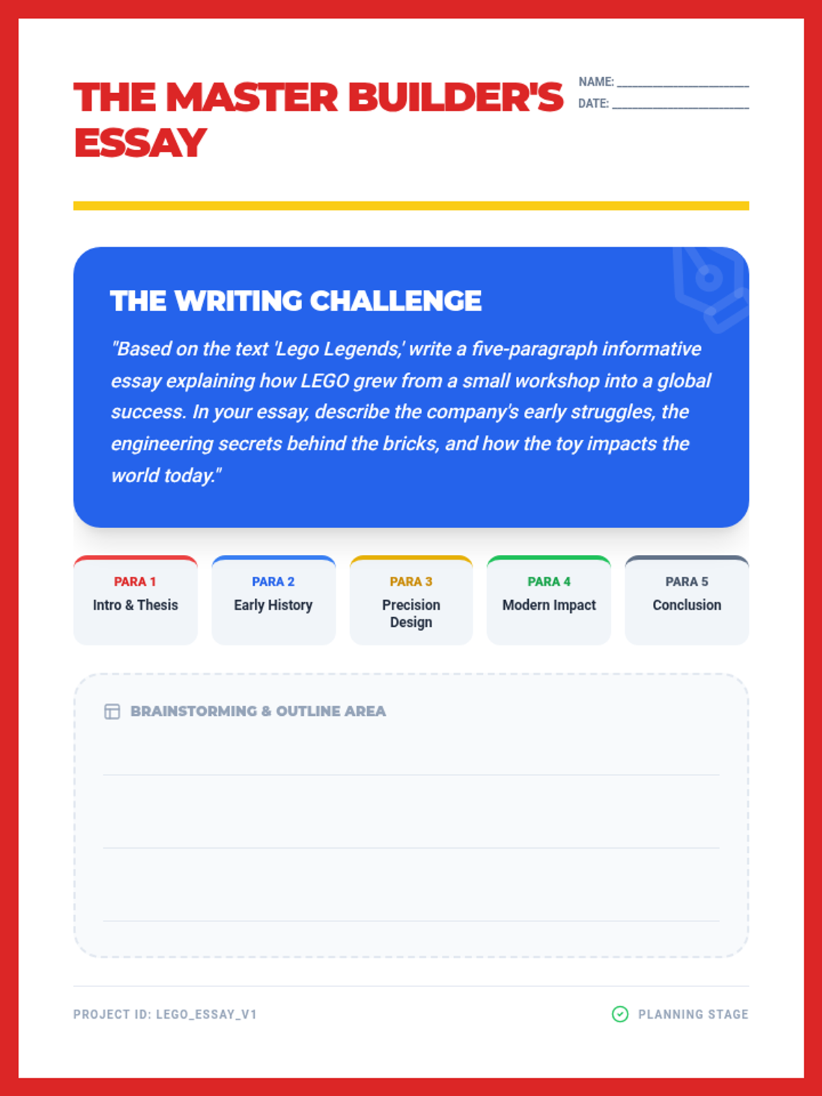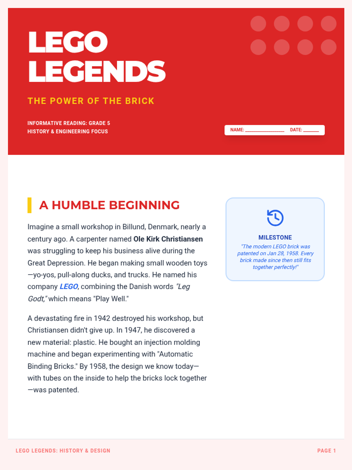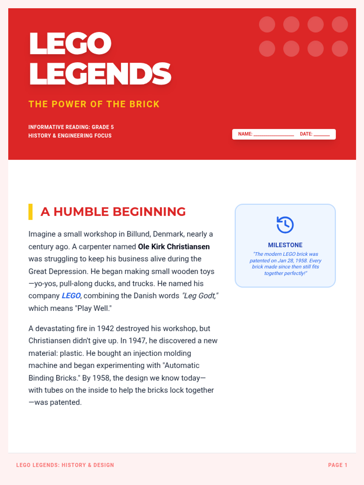 An informative lesson for 5th graders exploring the history, science, and cultural impact of LEGO bricks, accompanied by a creative blueprint activity.