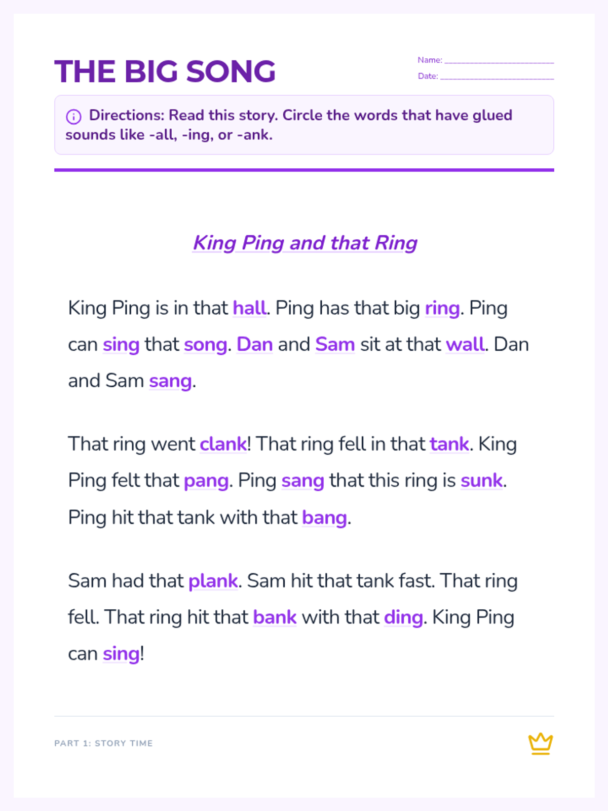A phonics-focused lesson for first graders targeting glued sounds (all, am, an, ang, ing, ong, ung, ank, ink, onk, unk) through a narrative story and fluency exercises.
