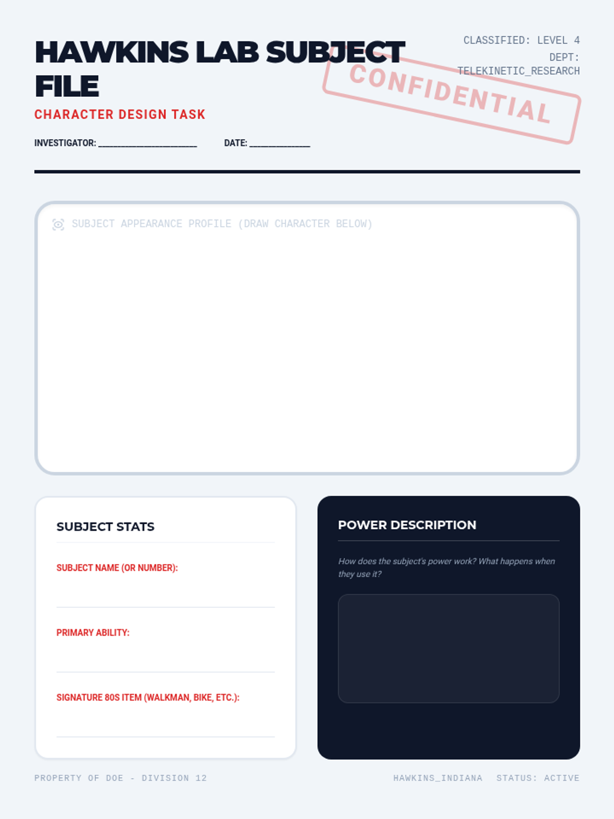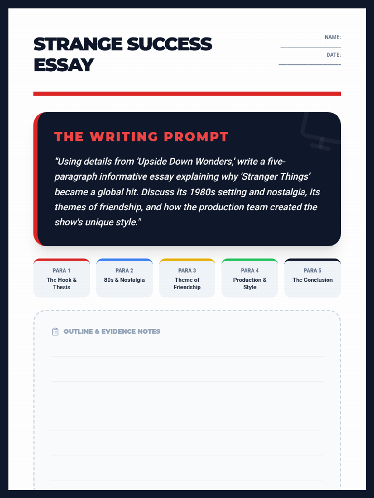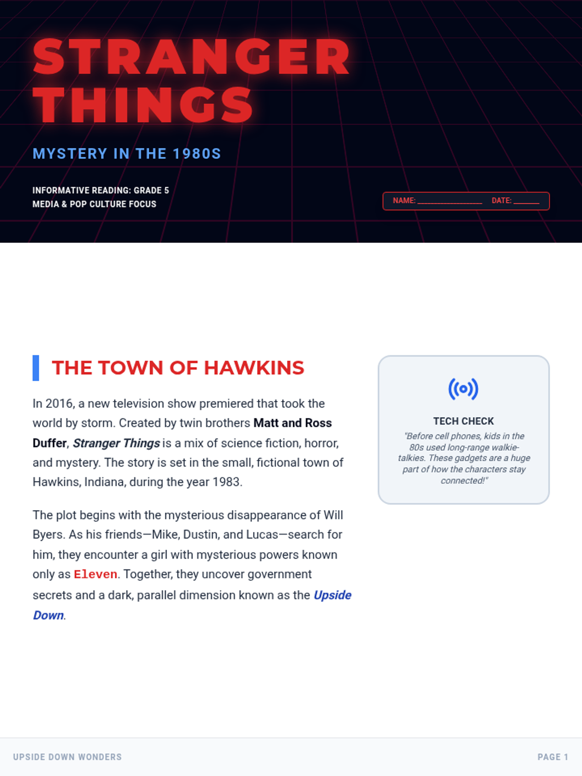 An informative lesson for 5th graders exploring the production, themes, and 1980s cultural influences of the hit show 'Stranger Things', accompanied by a creative character design activity.