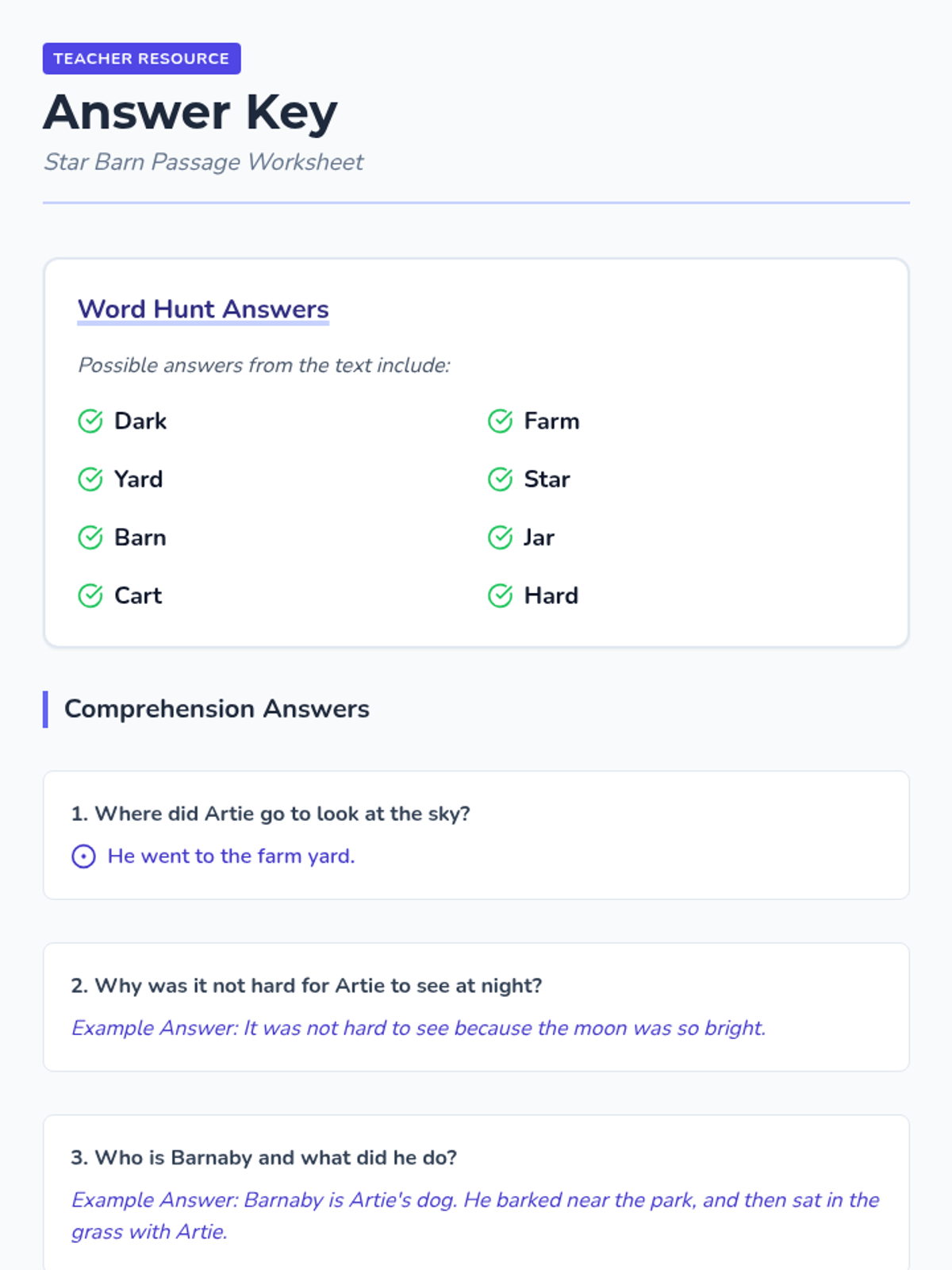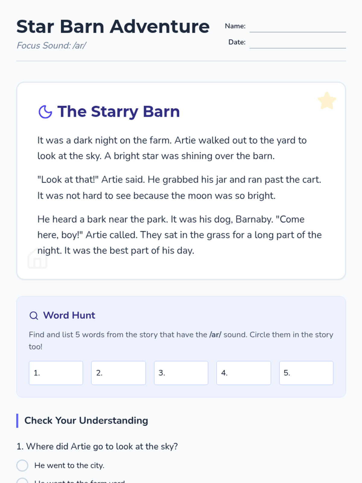 A foundational phonics lesson focusing on the 'ar' r-controlled vowel sound through an engaging narrative about a farm under the stars. Students will practice decoding and comprehension.