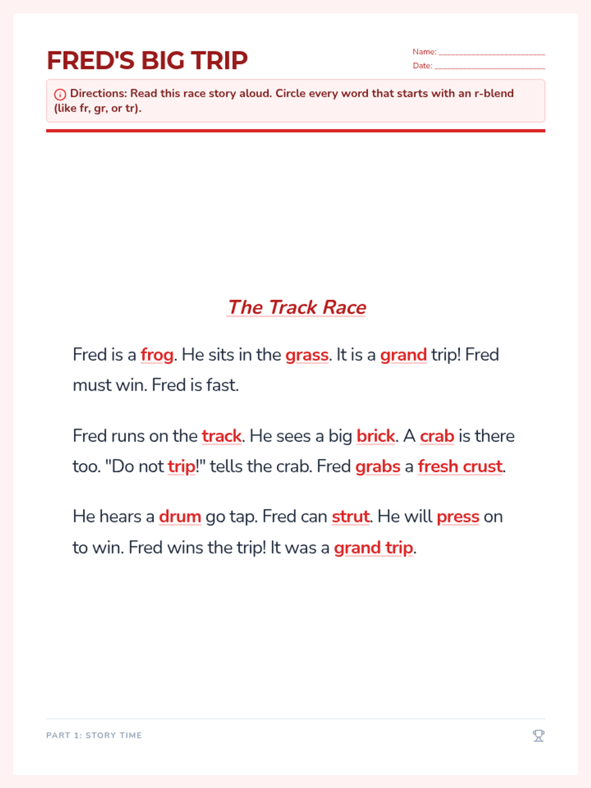 A phonics-focused lesson for first graders targeting r-blends (pr, tr, br, cr, str, dr, fr, gr) through a narrative story and fluency-building exercises.