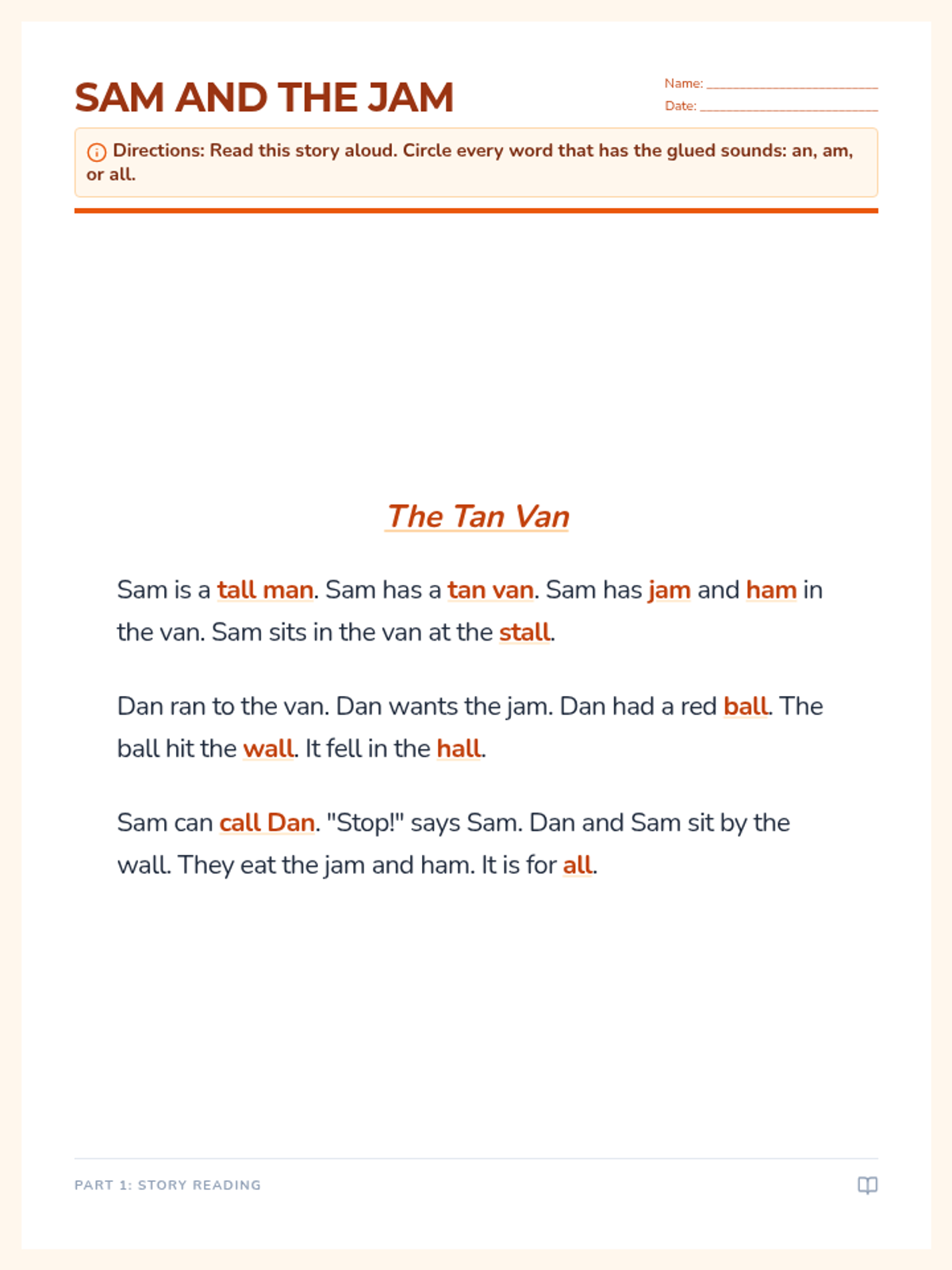 A phonics-focused lesson for first graders targeting the glued sounds 'an', 'am', and 'all' through a narrative story and fluency exercises.
