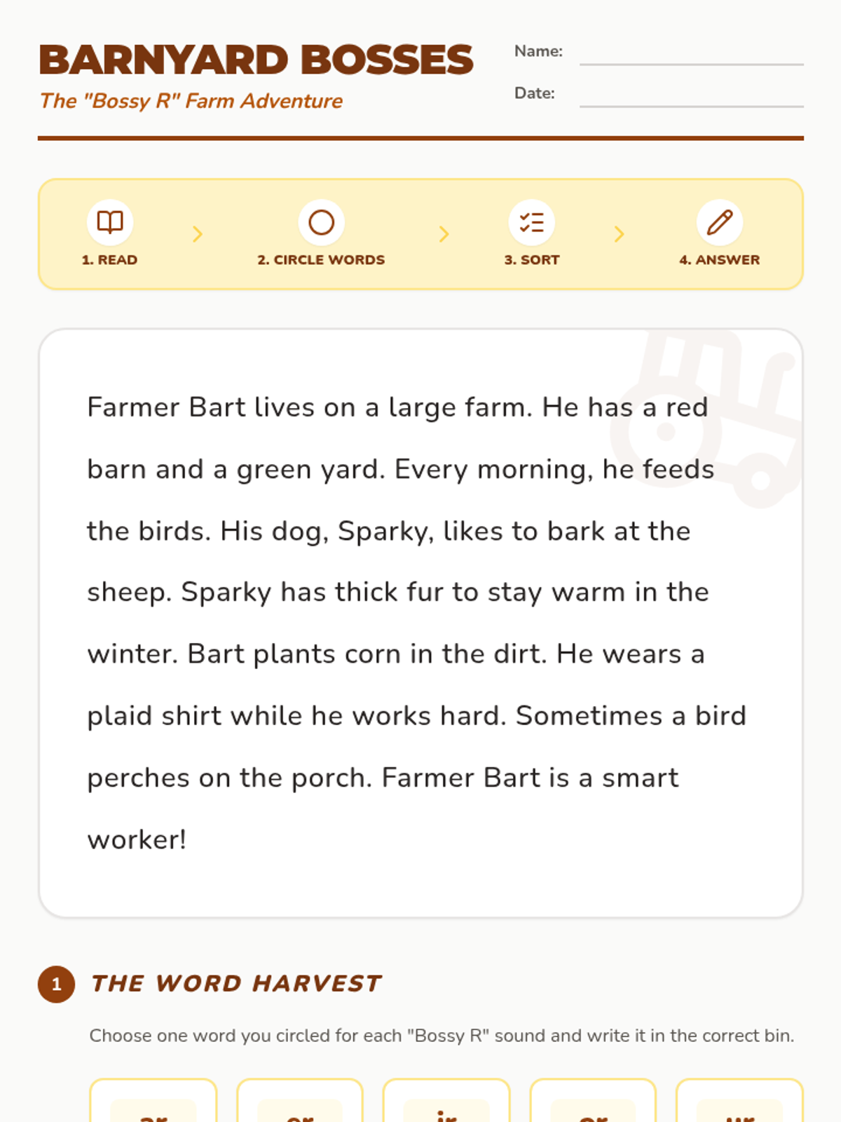 A foundational phonics lesson focusing on r-controlled vowels (ar, er, ir, or, ur) through a farm-themed reading adventure. Students will identify and decode 'bossy r' words in context.