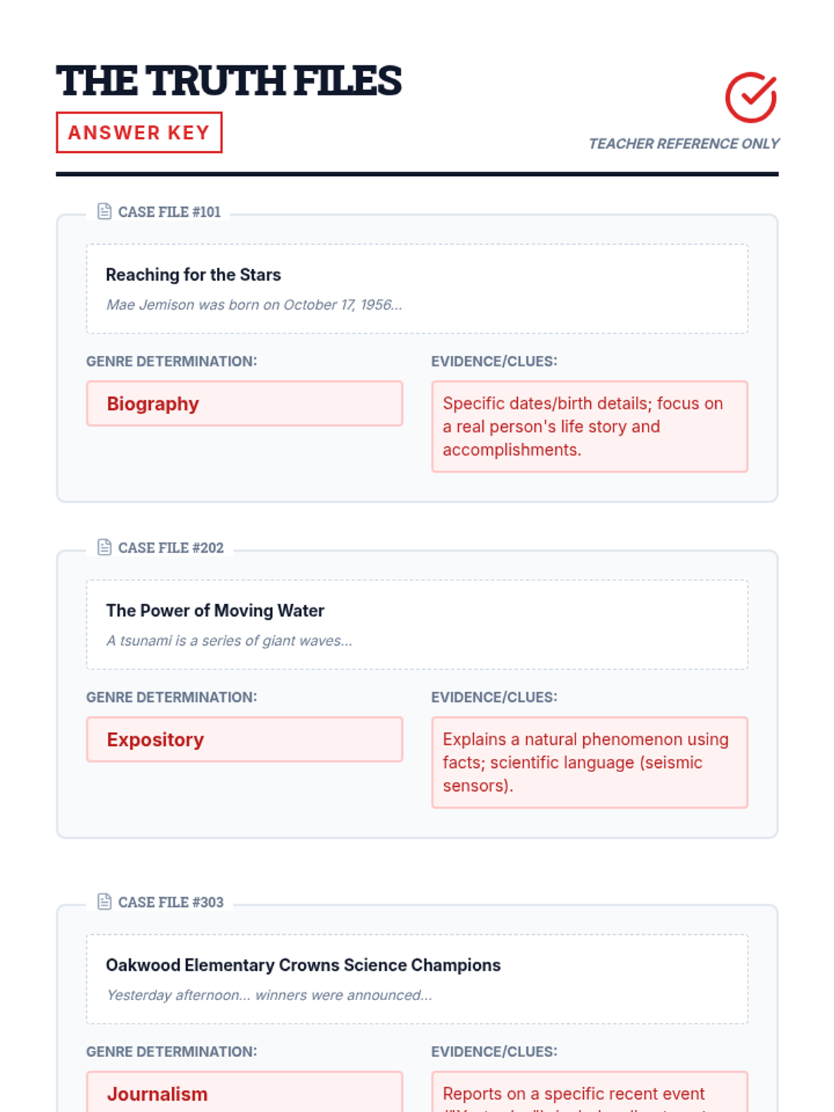 A targeted practice session for 5th graders to master the differences between biography, expository, and journalism through evidence-based analysis.