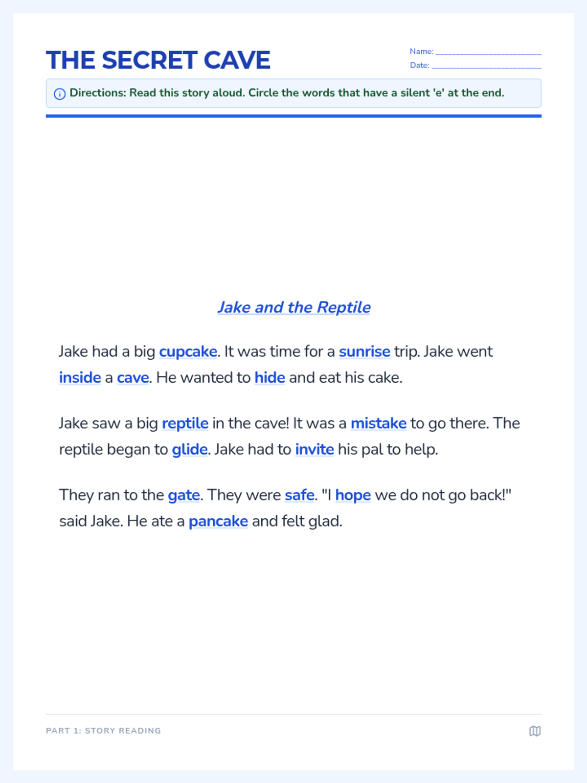 A phonics-focused lesson targeting the vowel-consonant-e (V-e) syllable type, featuring one-syllable words and two-syllable words that combine closed and V-e syllables.