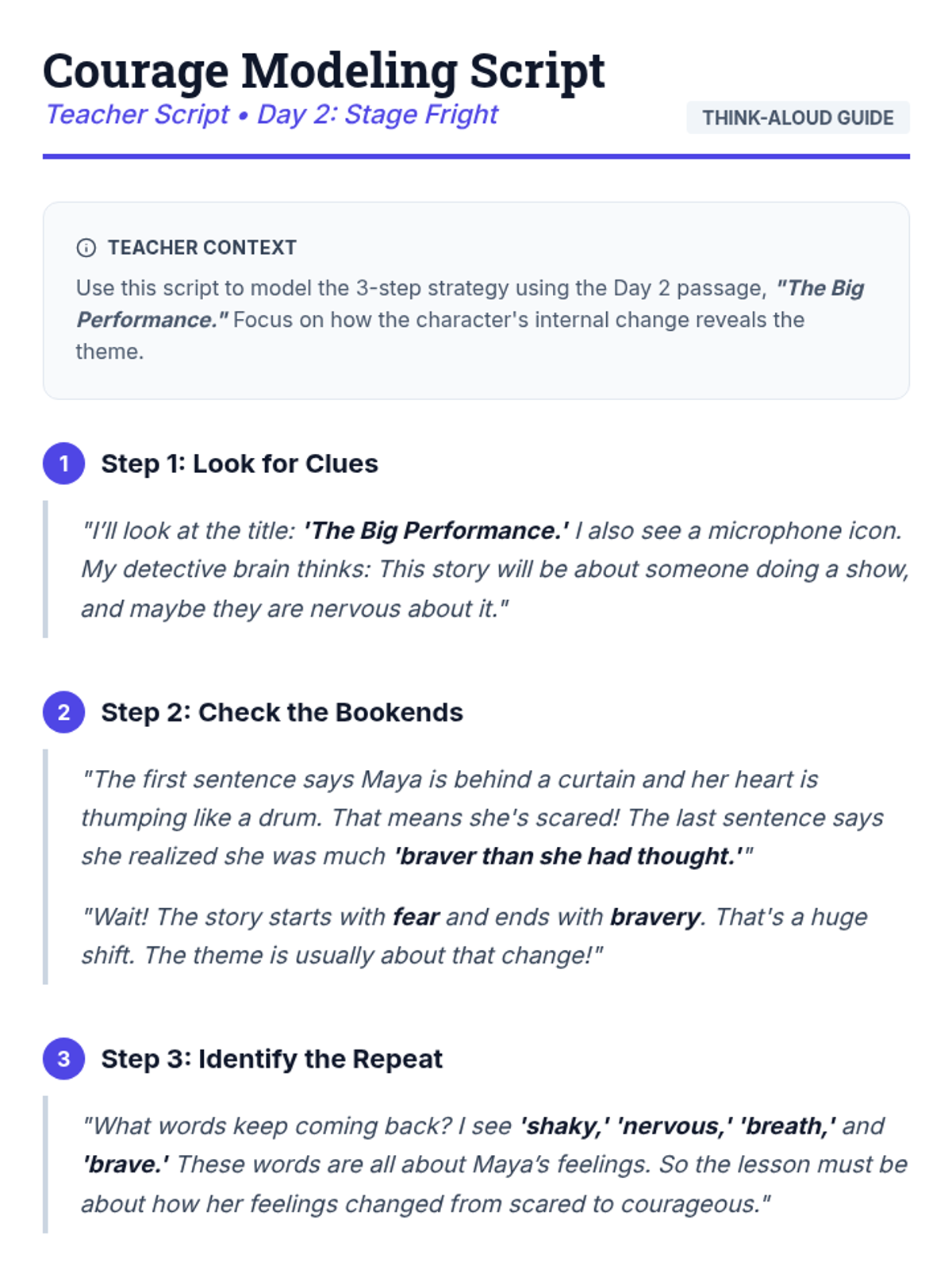 Students read a story about a student overcoming stage fright to determine the theme of courage.