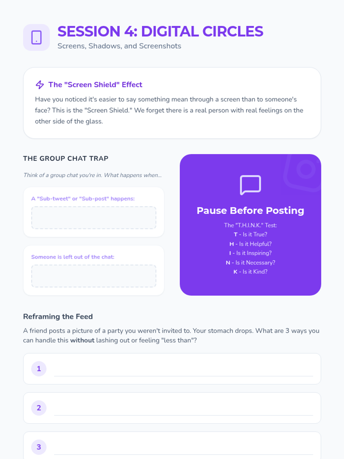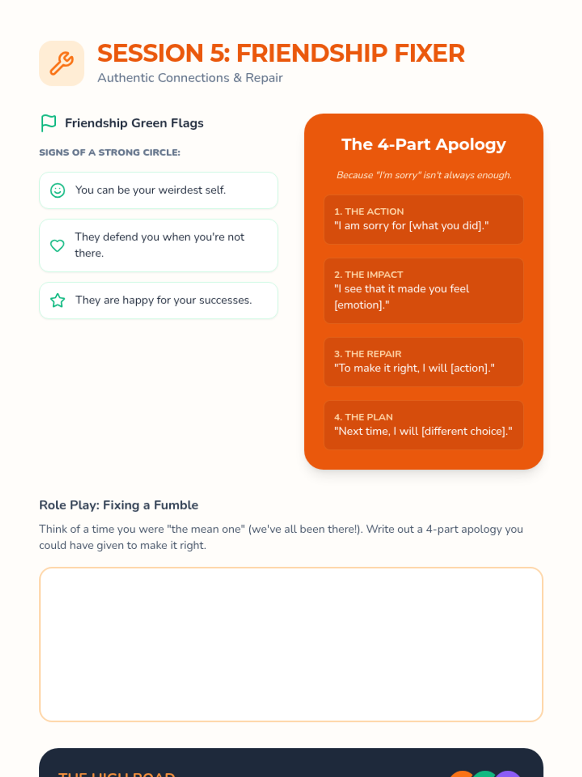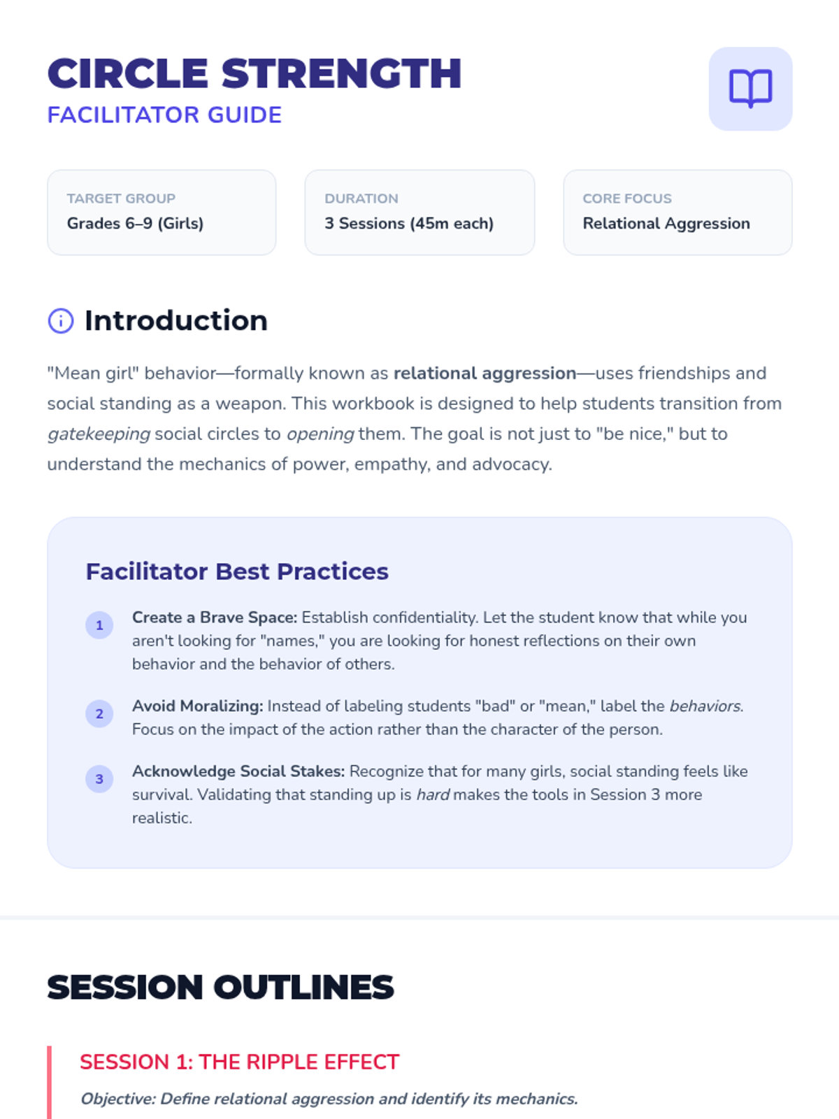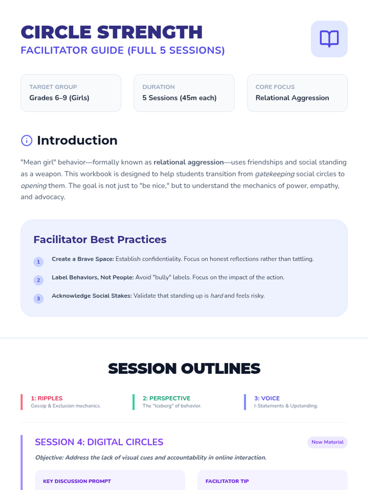 A multi-session series designed to address relational aggression by building empathy, identifying harmful social patterns, and empowering students with self-advocacy tools.