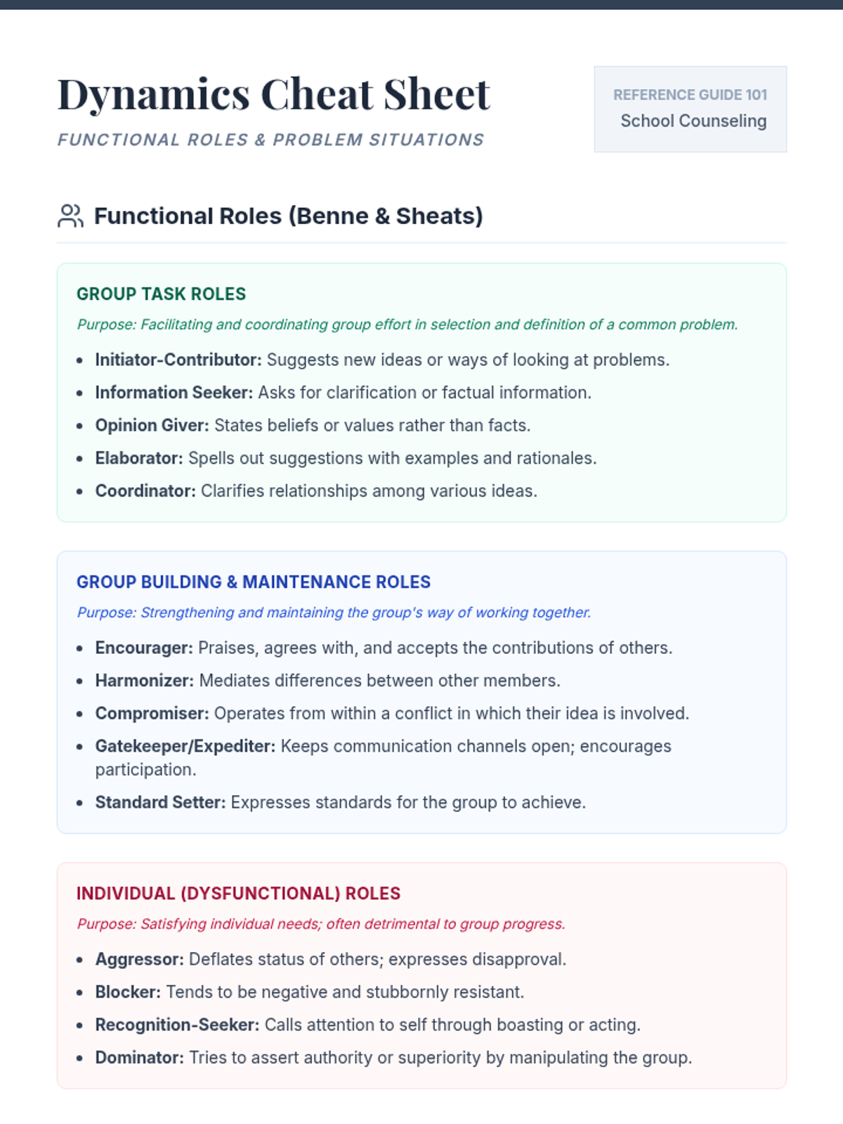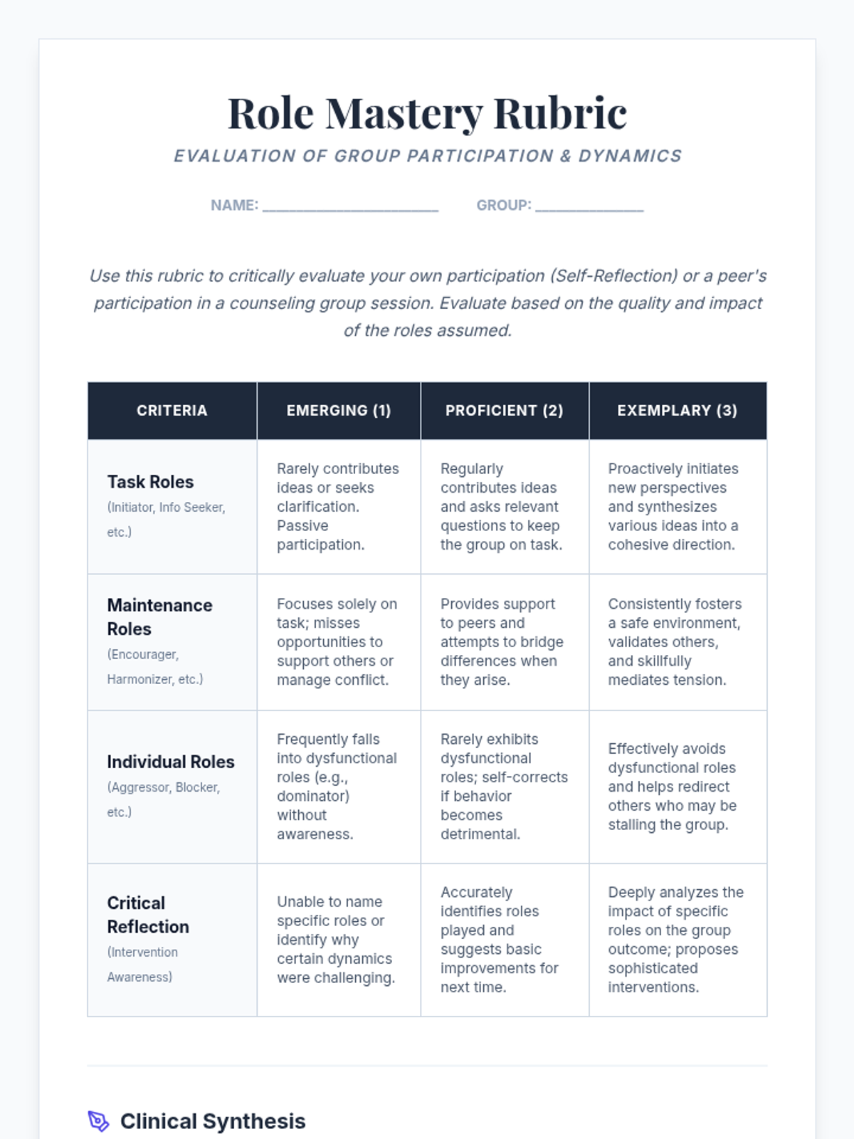 A comprehensive lesson for school counseling graduate students to master group member roles and intervention strategies for challenging group dynamics. Students will move from theory to application through case study analysis and self-reflection.