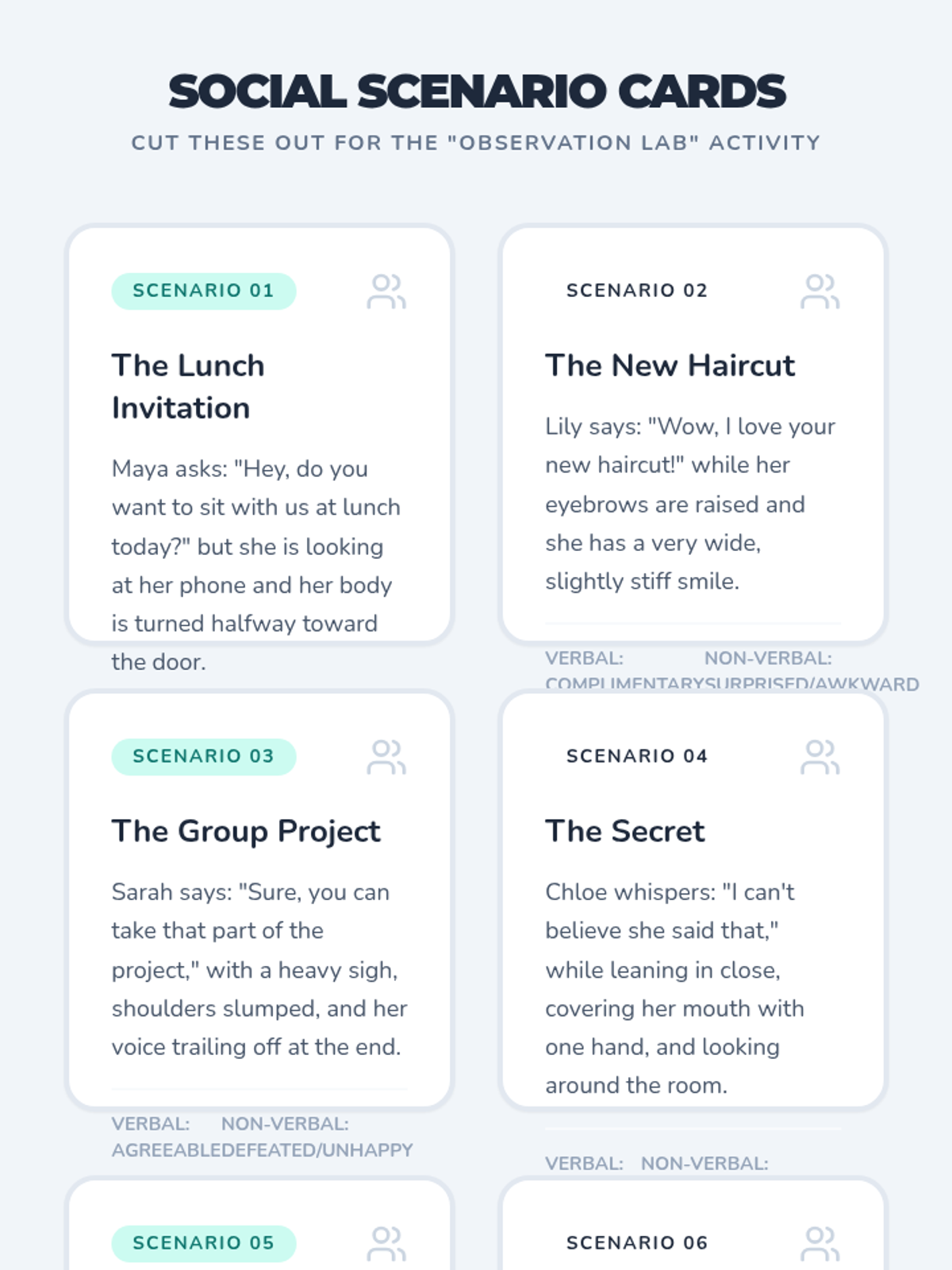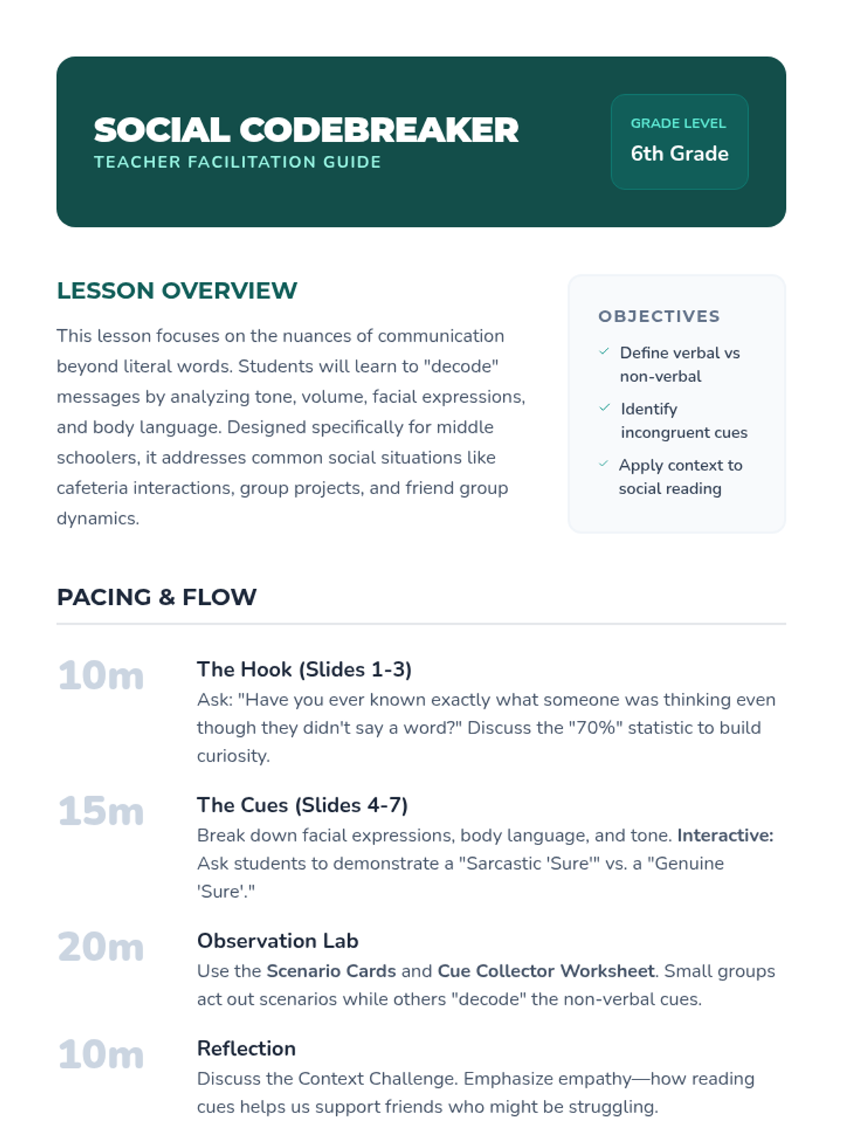 A lesson designed for middle school students to master the art of reading verbal and non-verbal social cues, focusing on empathy and effective communication in real-world scenarios.