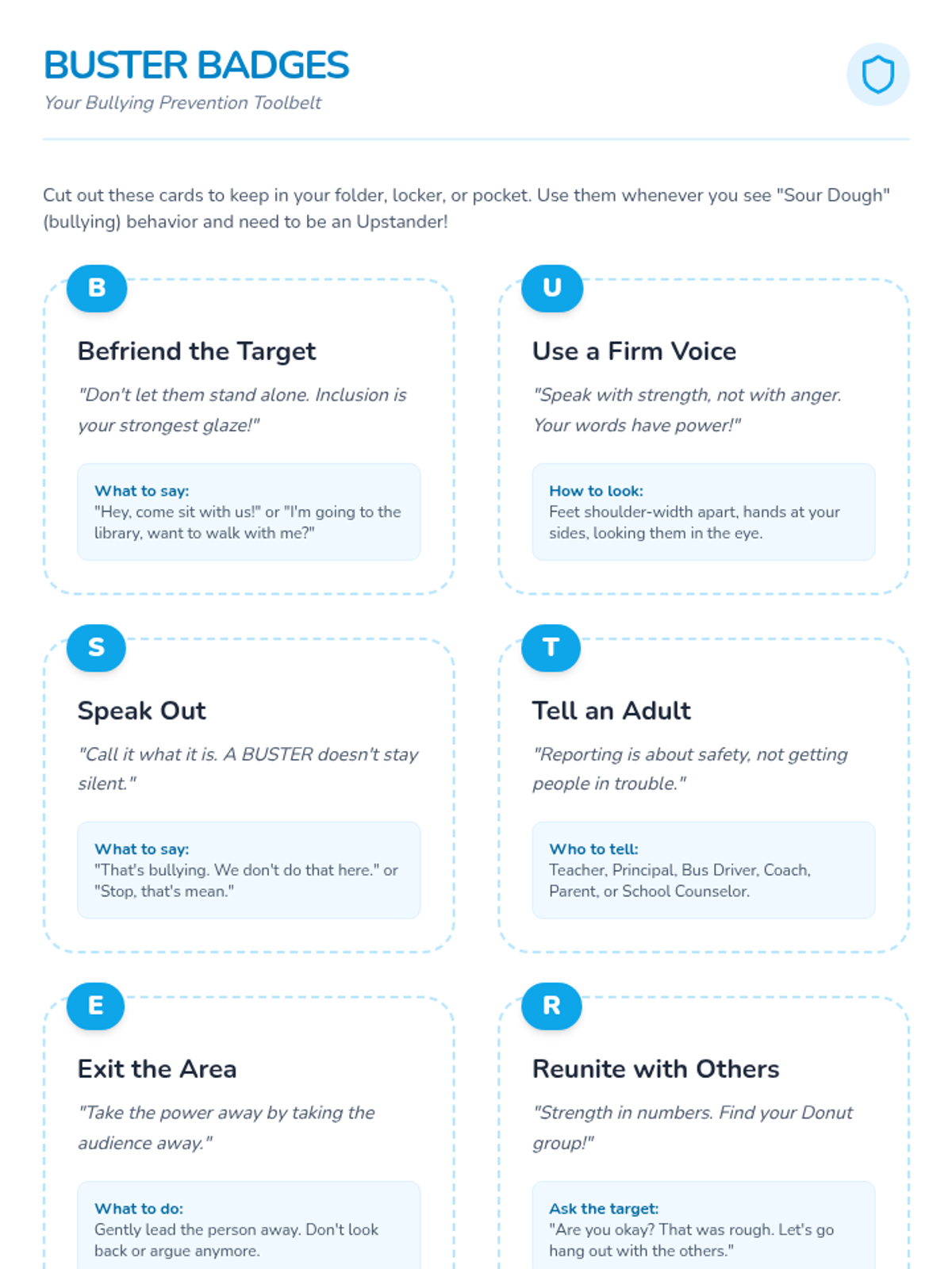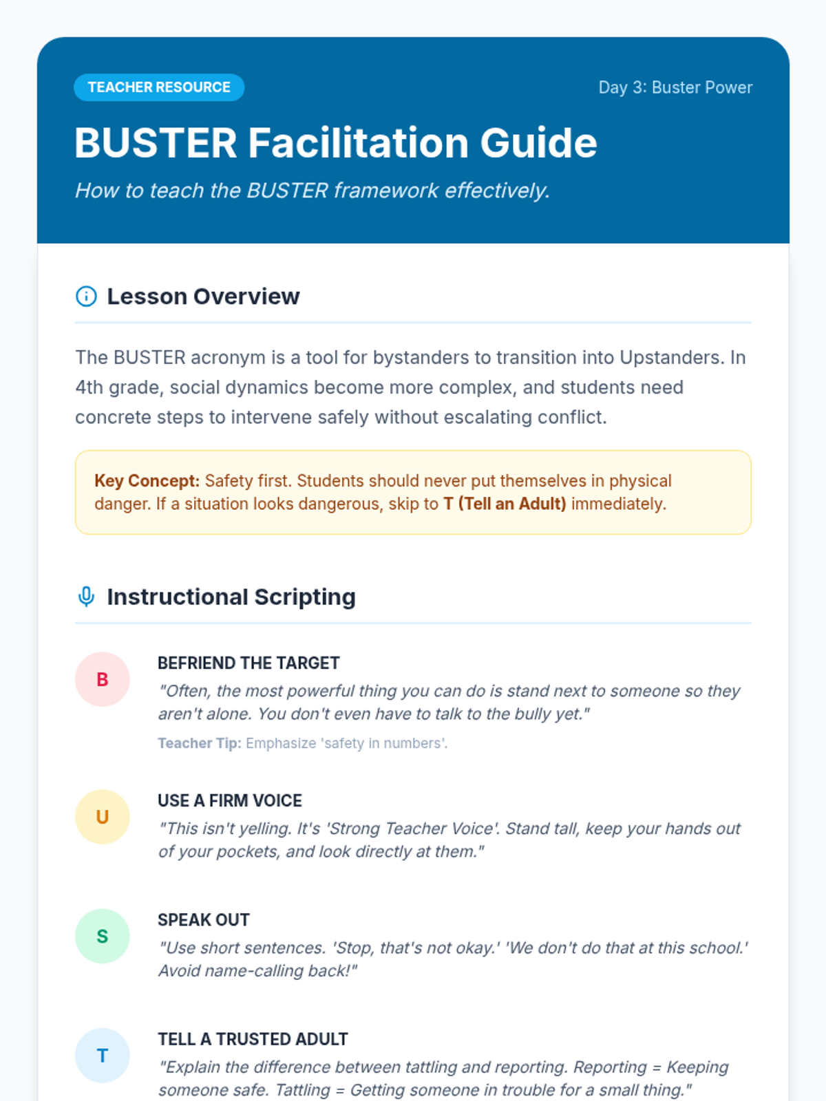 Introduces the BUSTER framework for bullying prevention, defining each letter and providing a clear action plan for bystanders and targets.