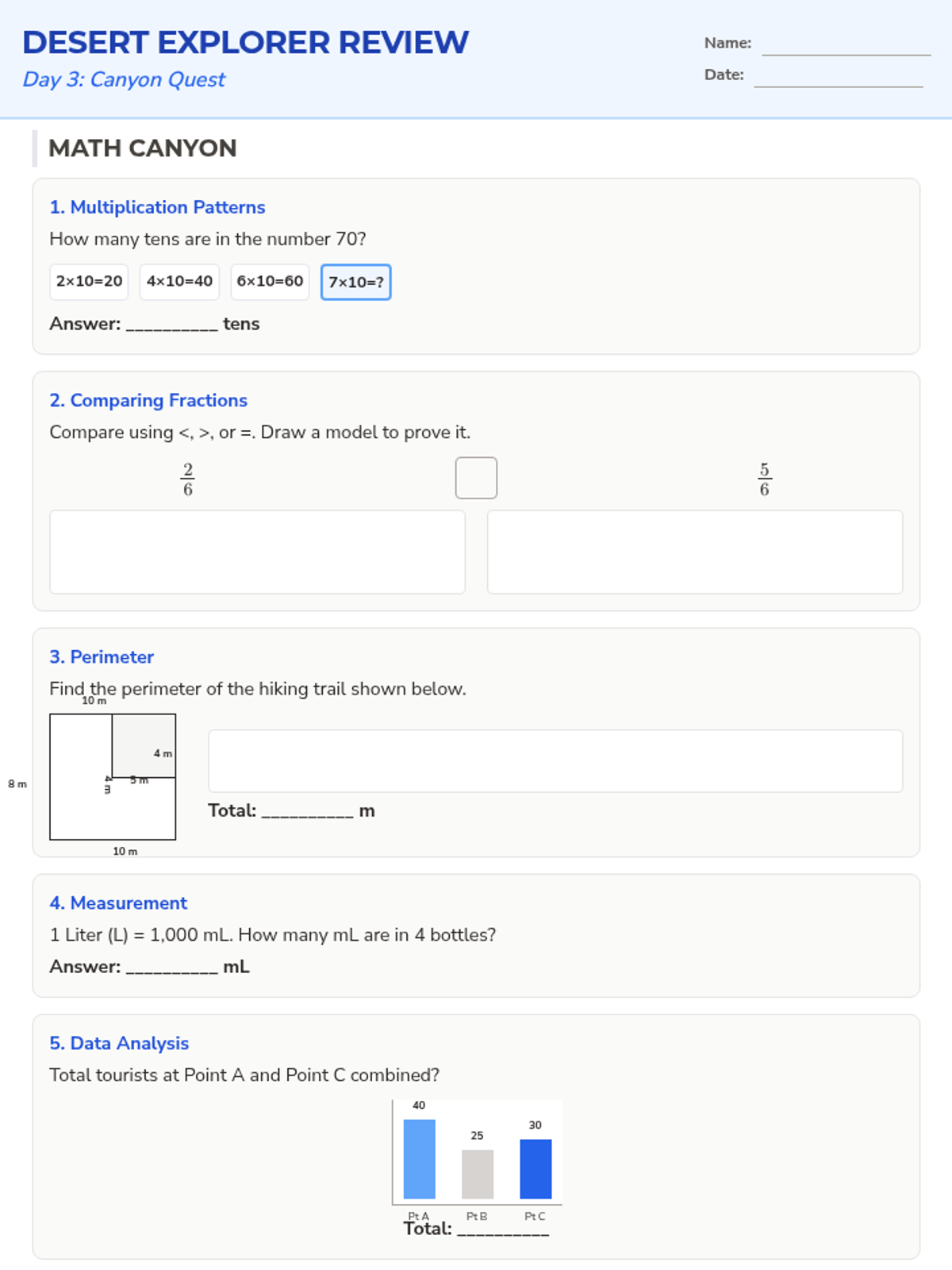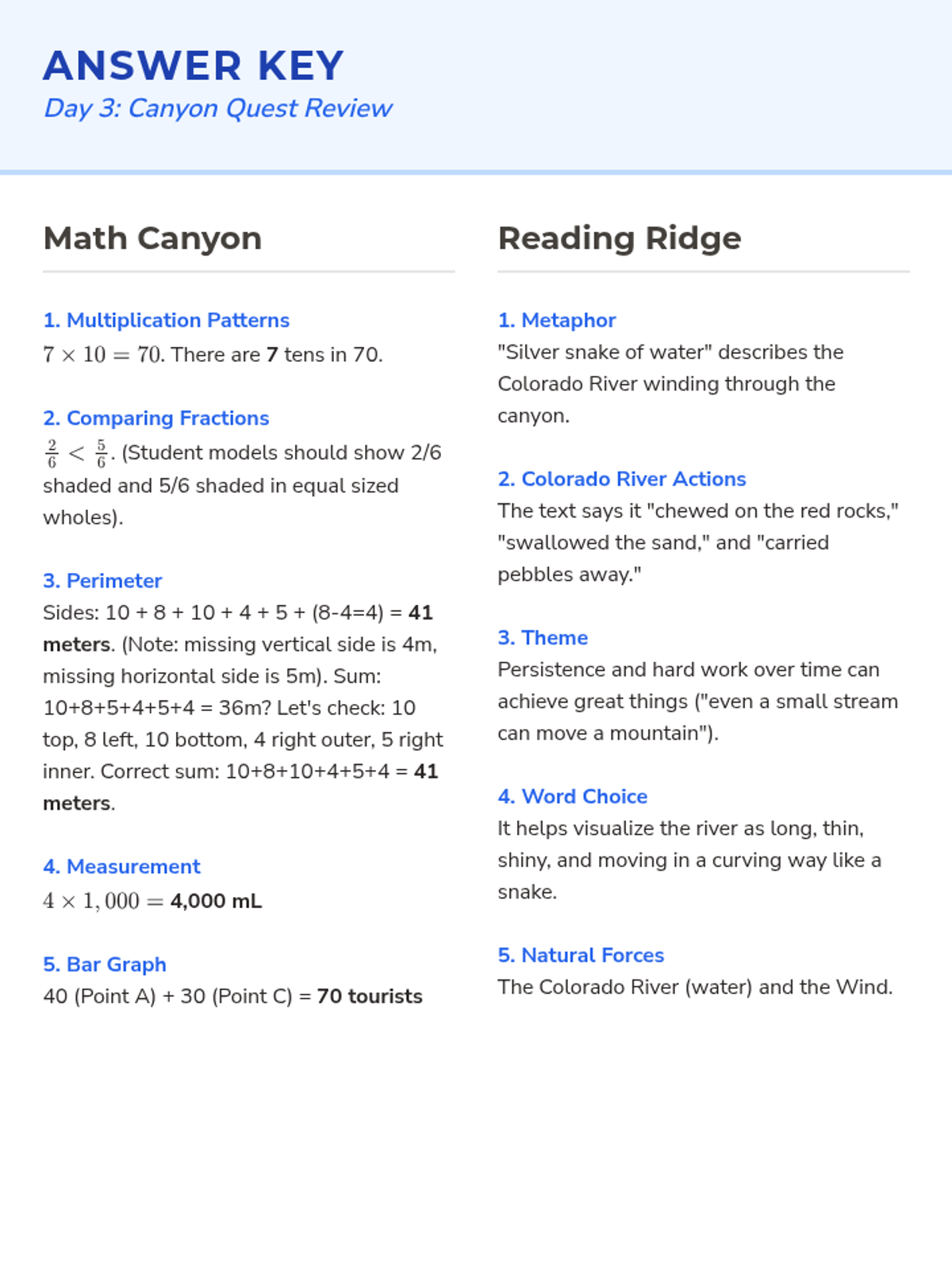 Day 3 of the spiral review, featuring multiplication patterns, comparing fractions, perimeter of irregular shapes, and a legend about the Grand Canyon.