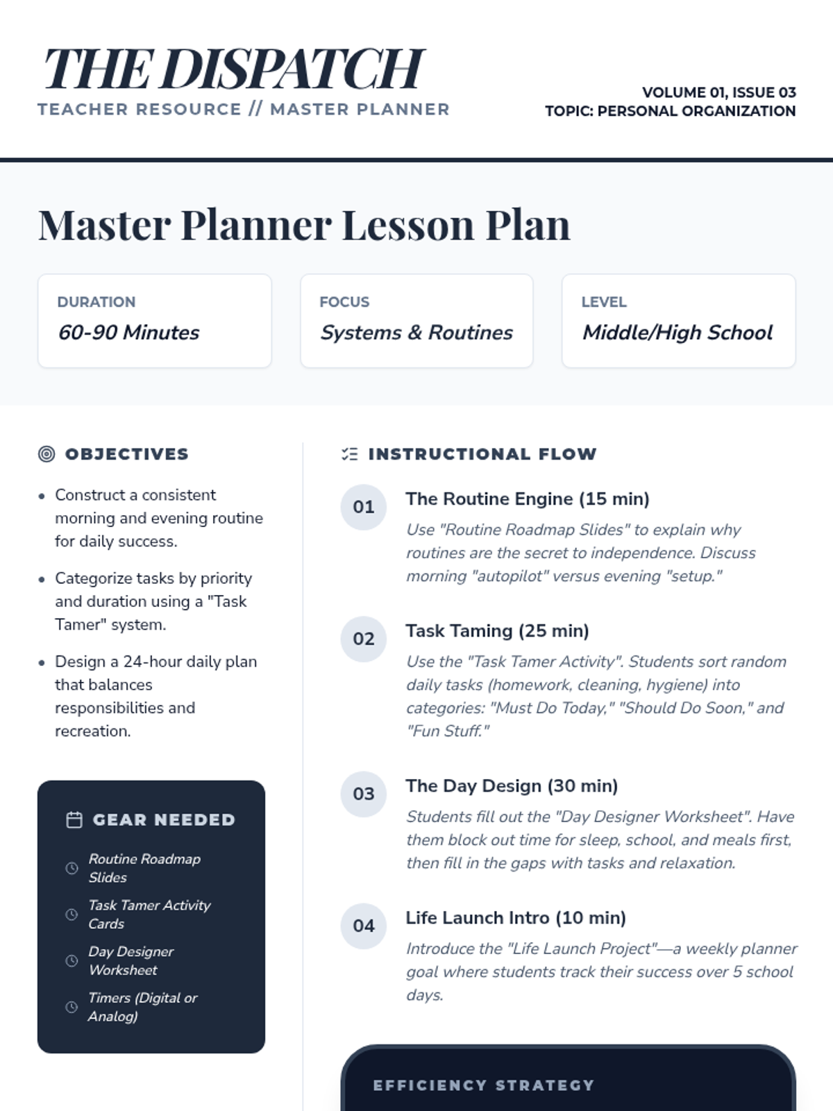 A comprehensive lesson on executive functioning skills, focusing on organization, time management, and task initiation through a 'Command Center' theme. Includes UDL-aligned tools for all students to manage their cognitive workload effectively.