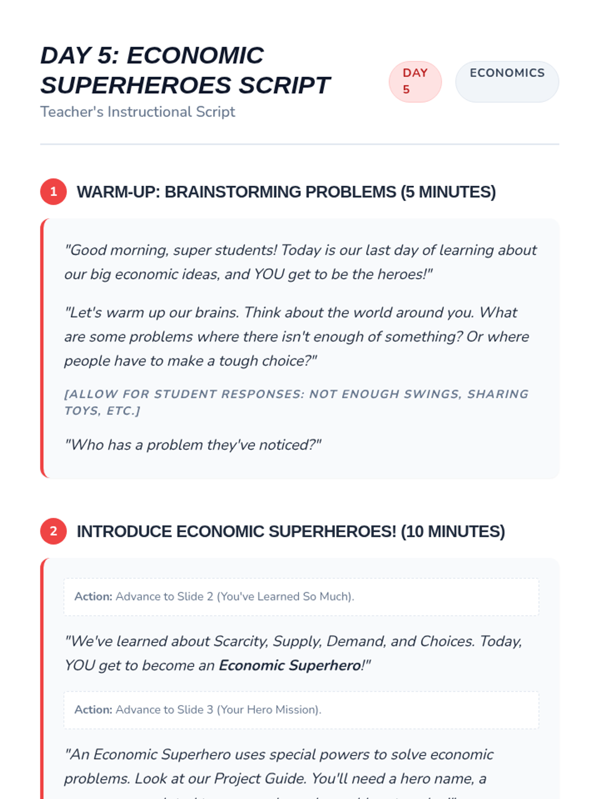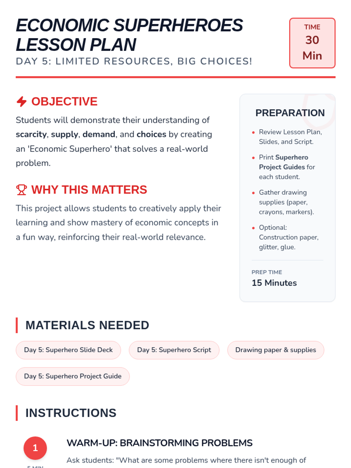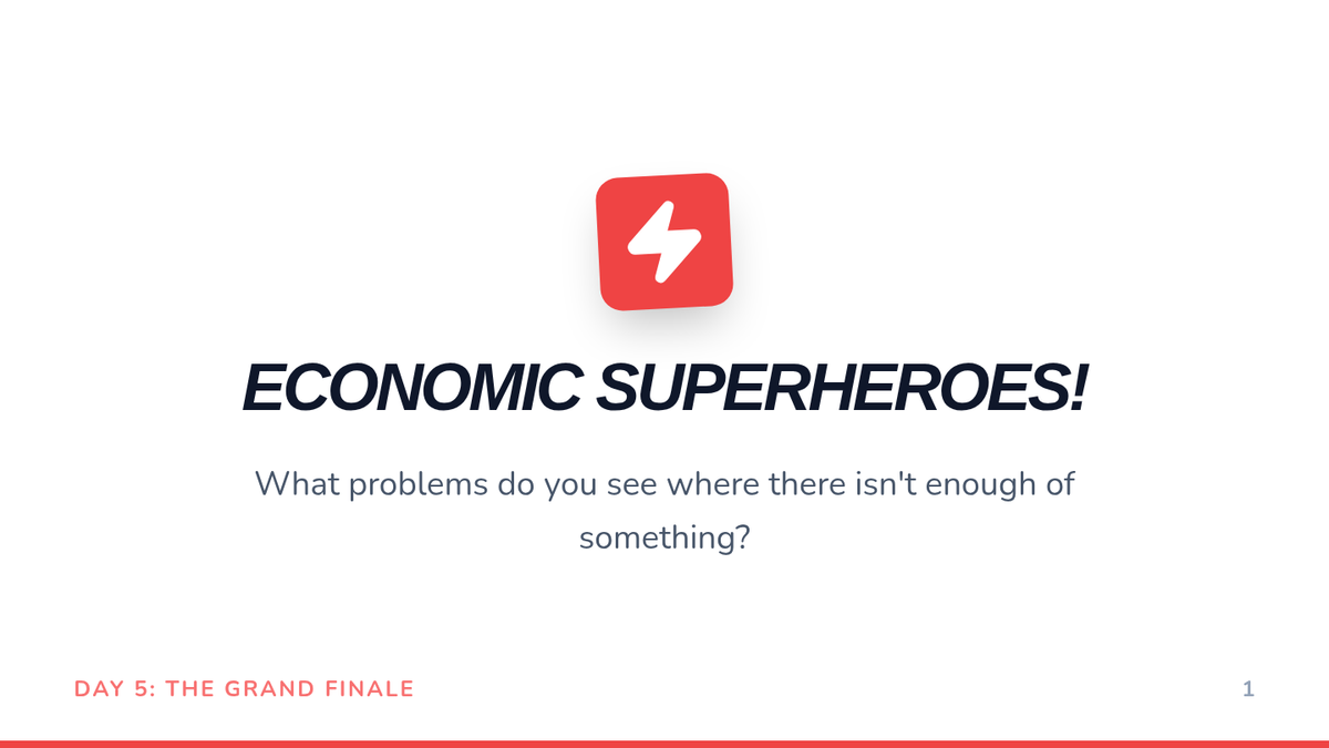 Students will demonstrate their understanding of scarcity, supply, demand, and choices by creating an 'Economic Superhero' that solves a real-world problem.