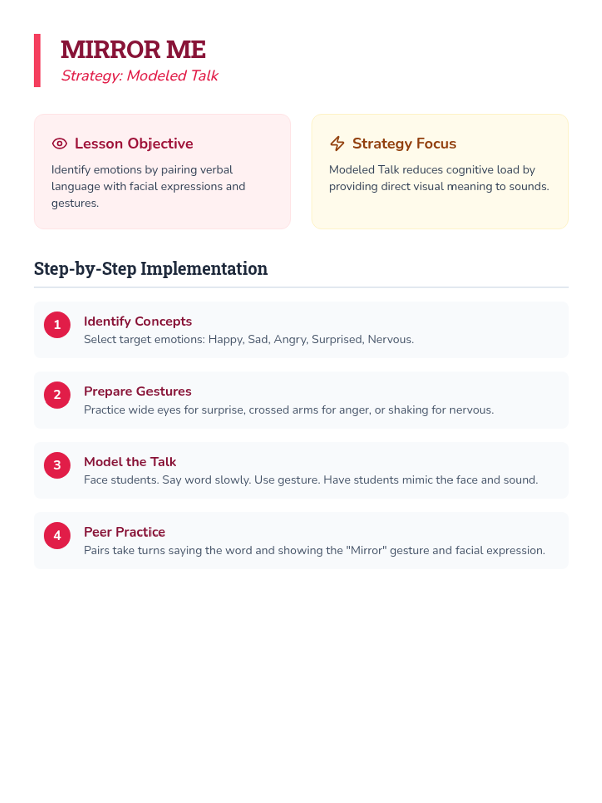 Uses gestures, facial expressions, and slowed speech to demonstrate emotional vocabulary and social interactions, making language comprehensible for ELLs.