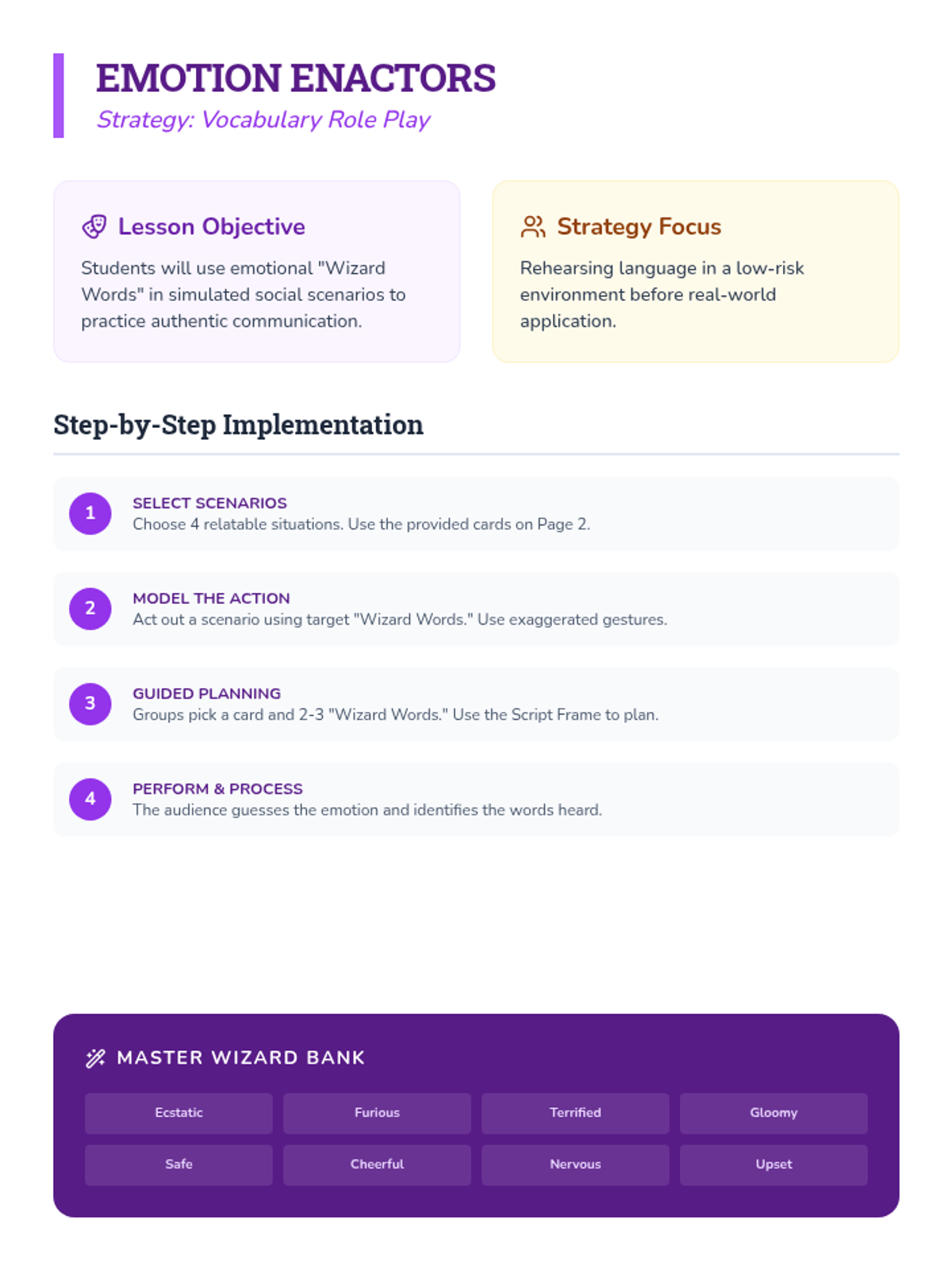 Students apply their expanded emotional vocabulary in simulated social situations, practicing the 'Vocabulary Role Play' strategy to solidify language acquisition through performance and interaction.