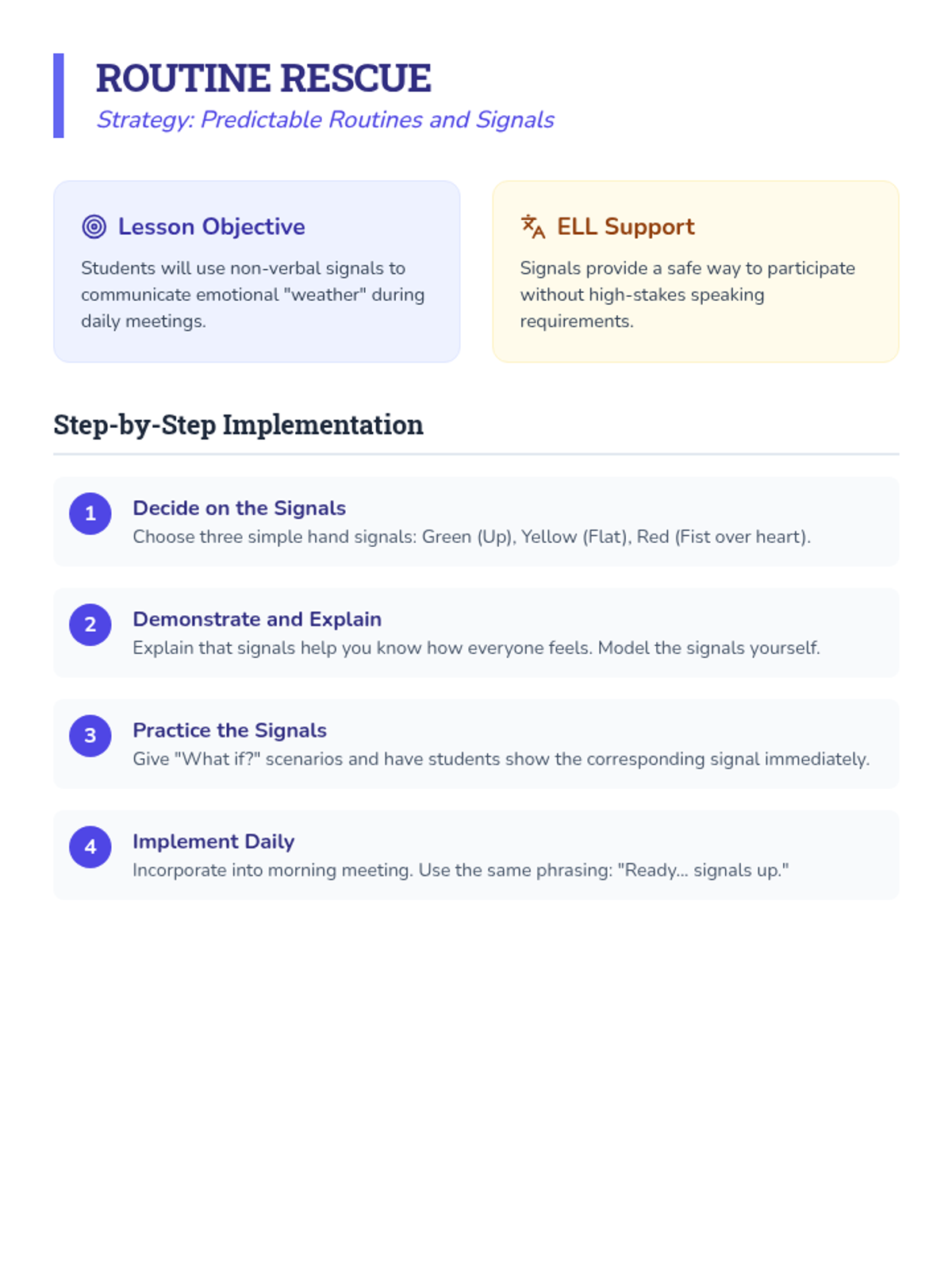 Establishes daily signals and routines for students to communicate their emotional state and readiness for learning, providing a safe and predictable classroom environment.