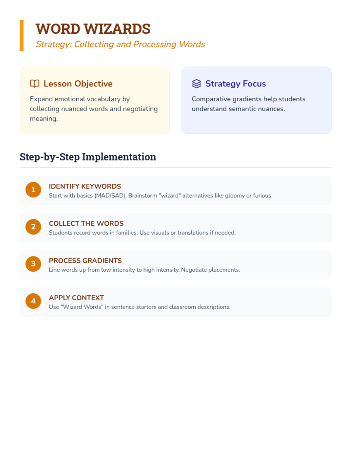 Builds a robust emotional vocabulary by systematically identifying, recording, and interacting with new words that describe complex feelings.