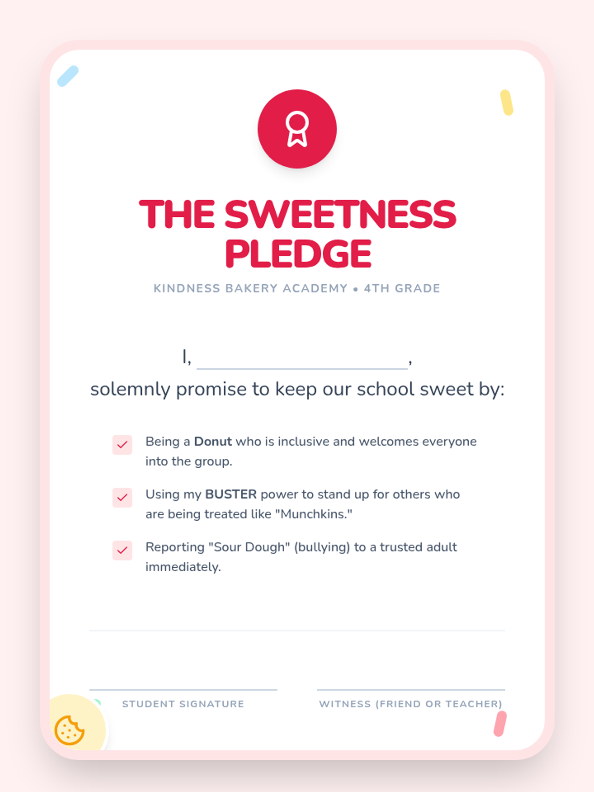 A culminating celebration where students sign a 'Sweetness Pledge' and reflect on how they will continue to be 'Donuts' in their community.