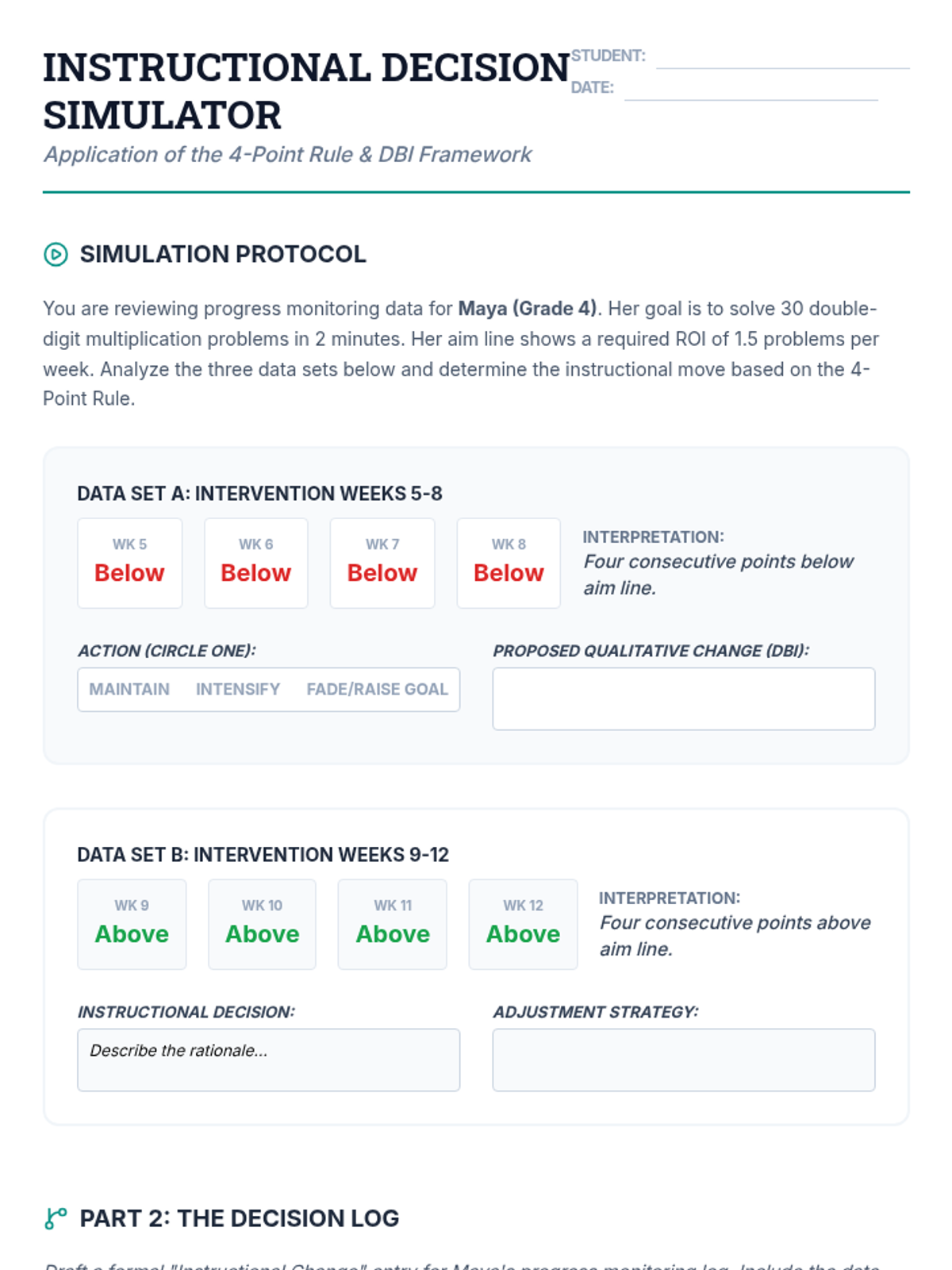 Application of data-based individualization (DBI) frameworks and standard decision rules to guide instructional changes and due process documentation.