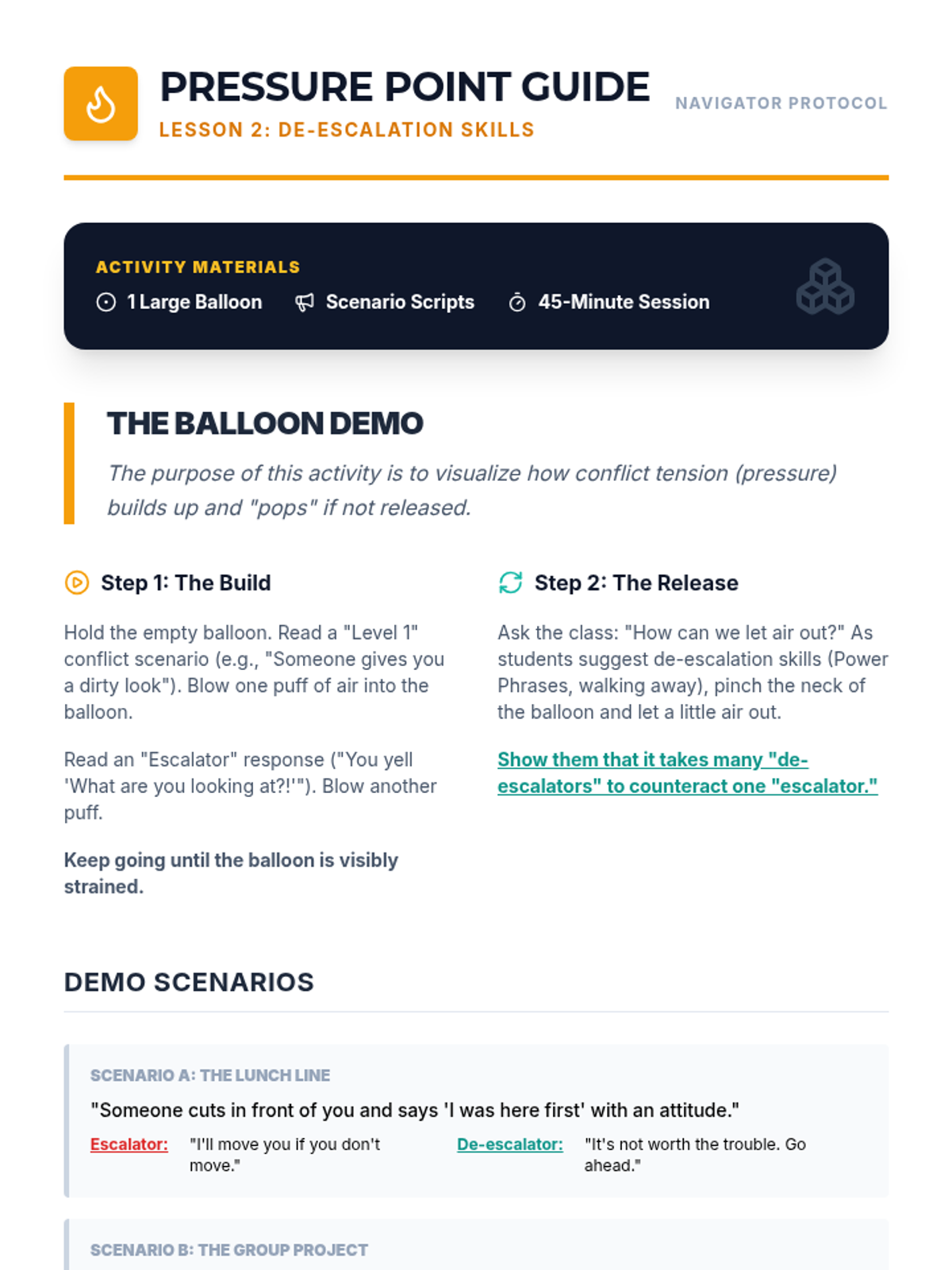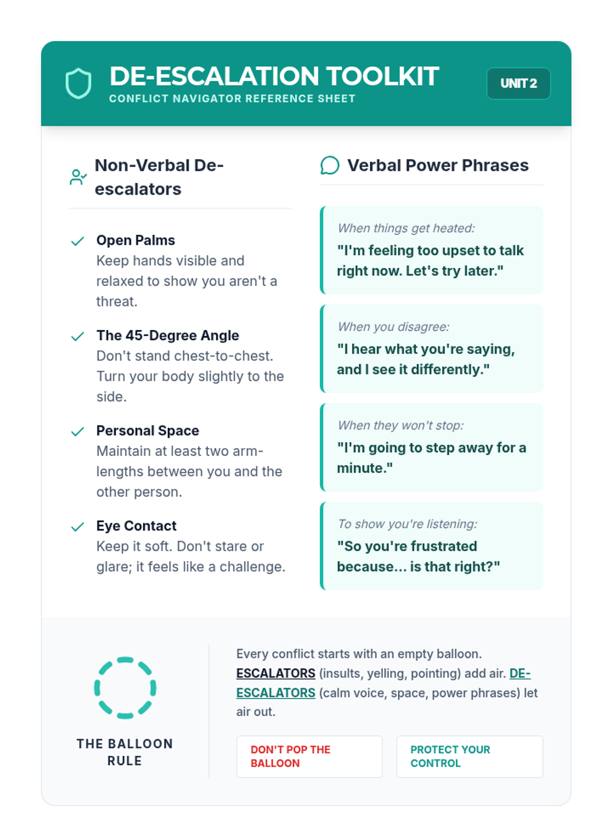 Focuses on practical de-escalation techniques, including body language and specific verbal phrases, to lower tension during peer disagreements.