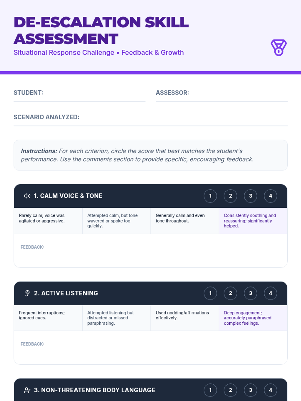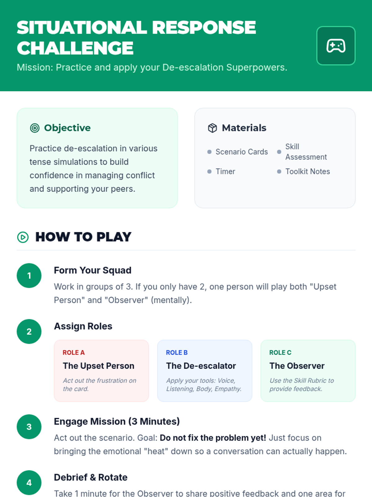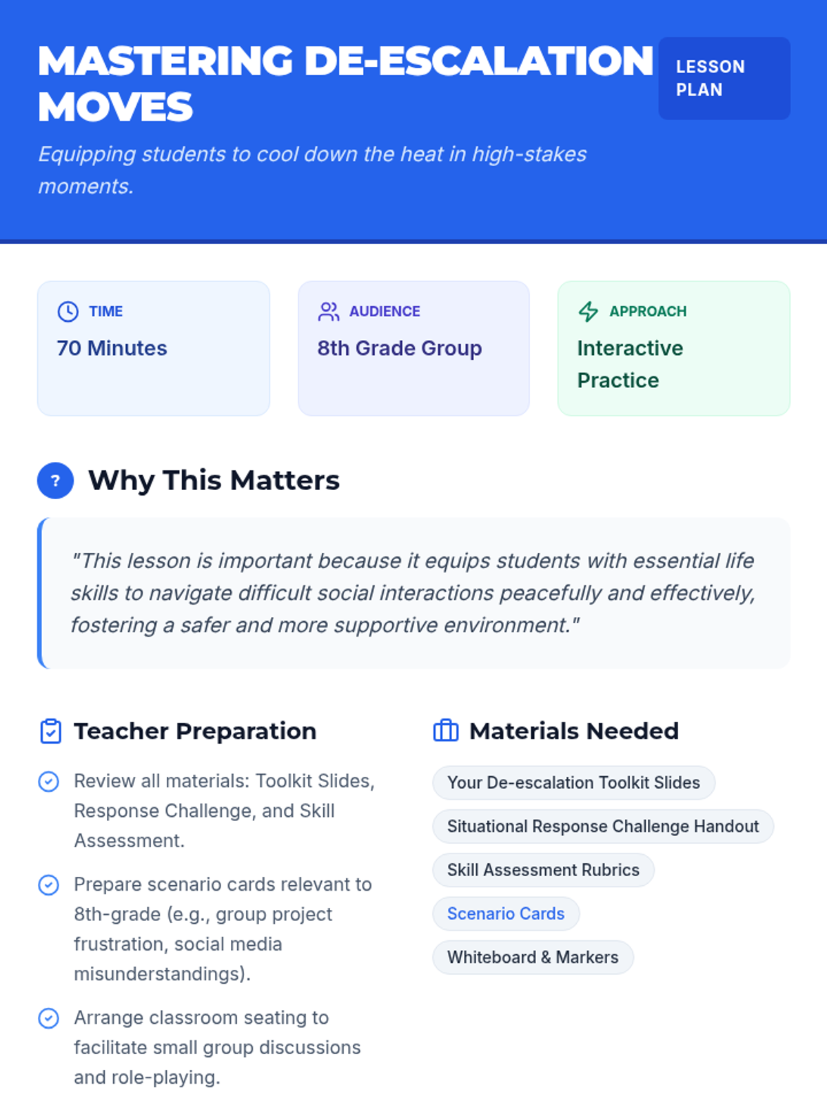 A 70-minute interactive lesson for 8th graders focusing on practical de-escalation techniques, including calm communication, active listening, and empathy to manage tense peer situations.