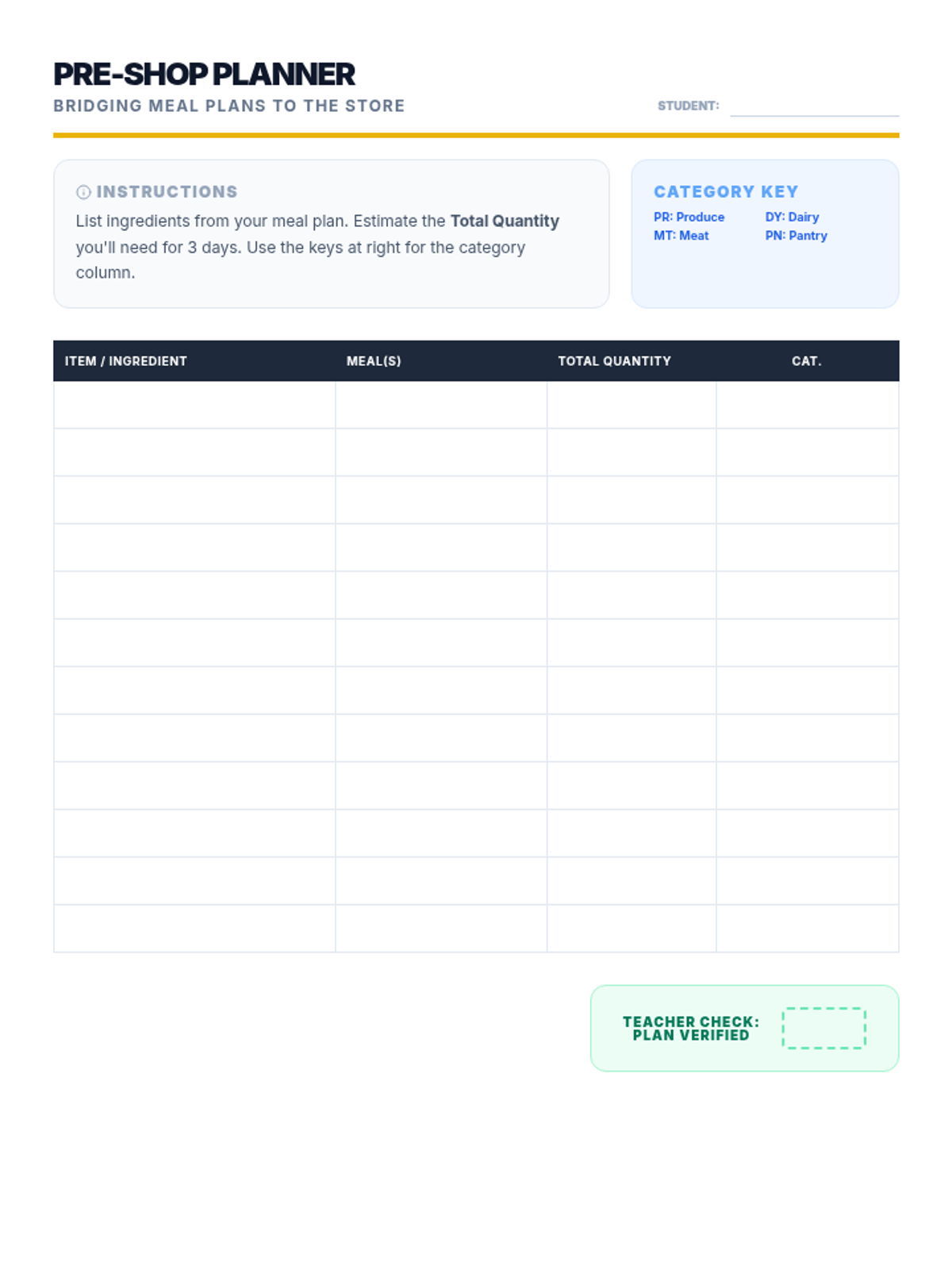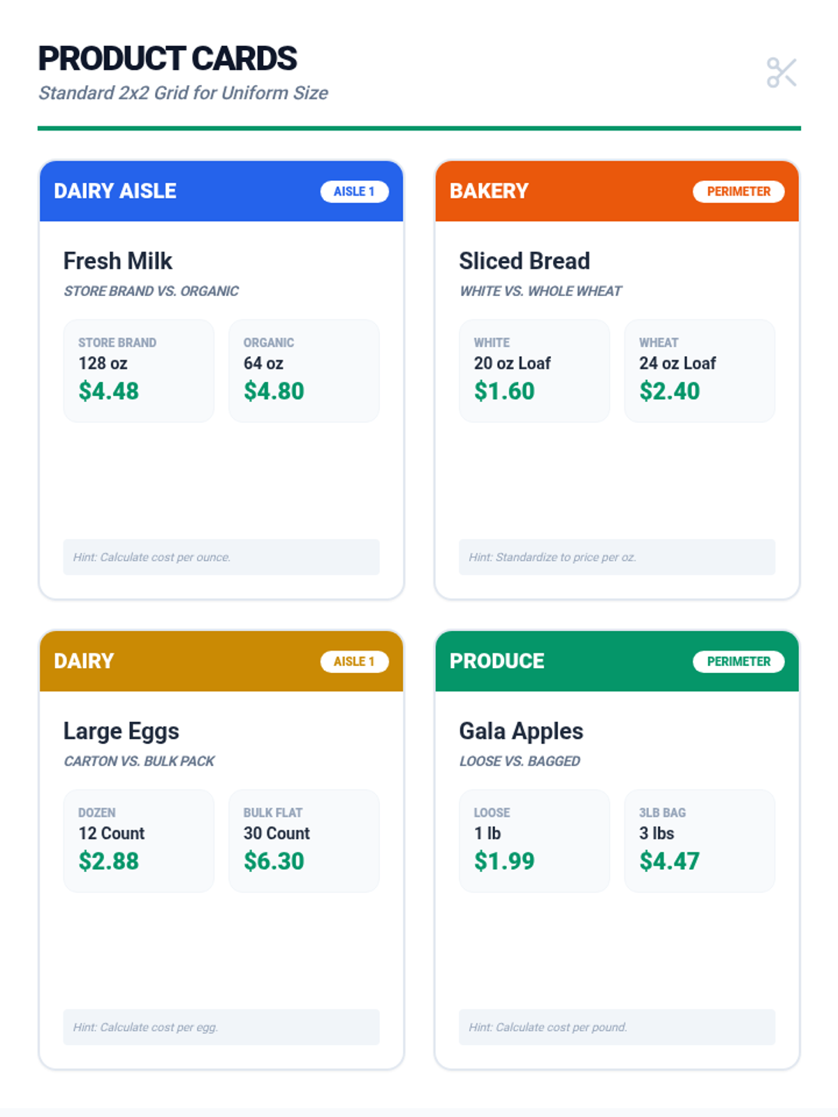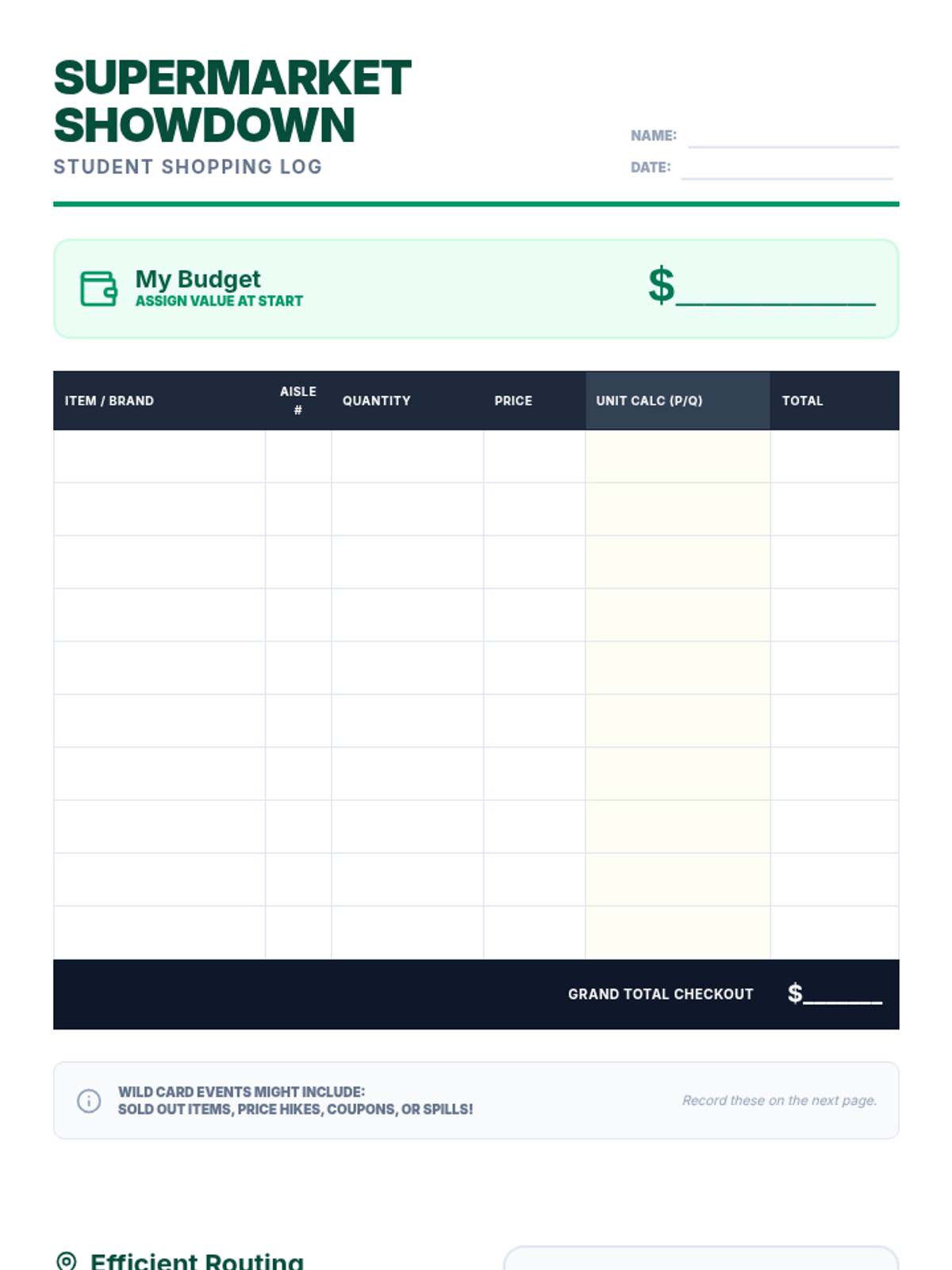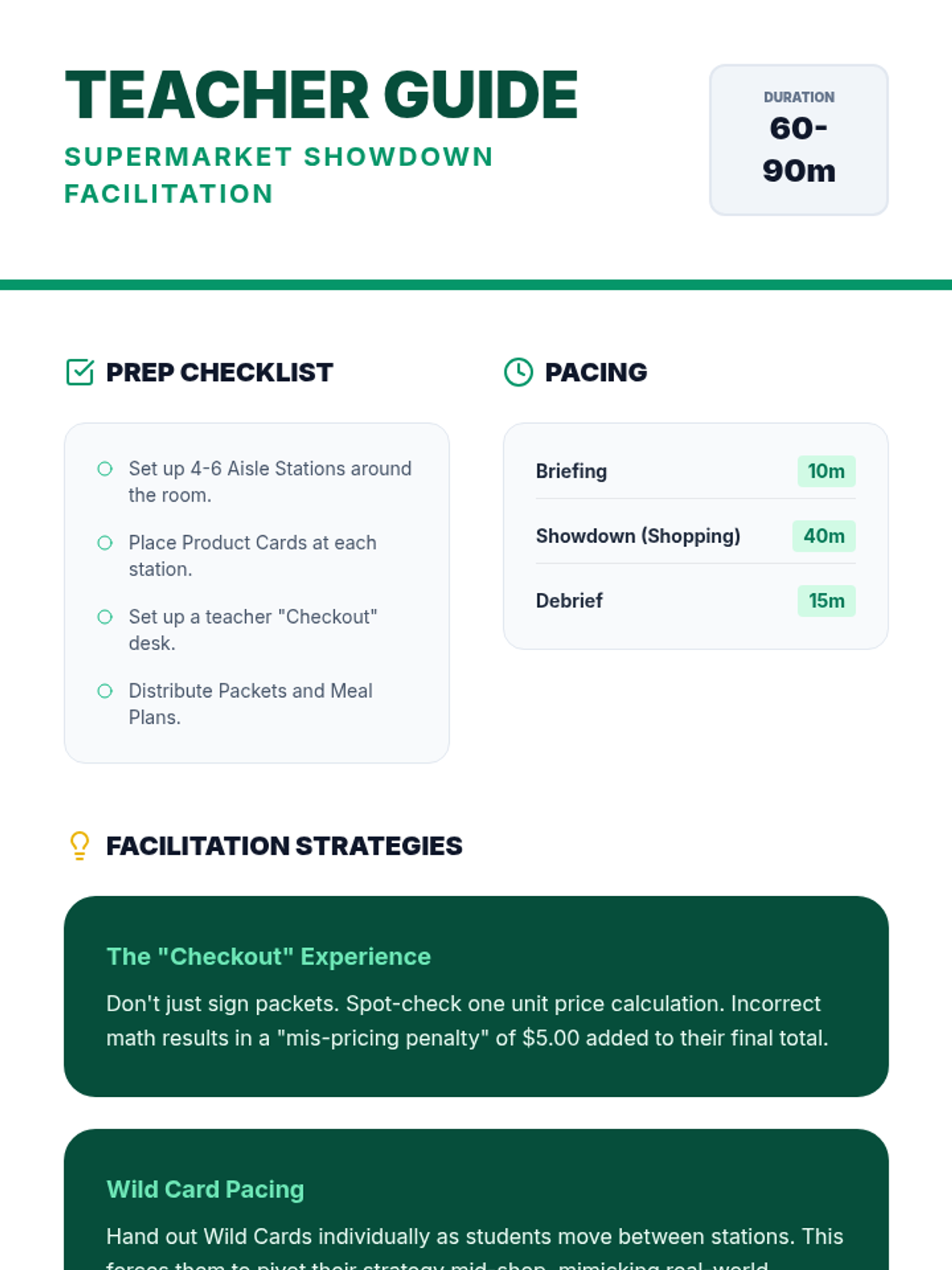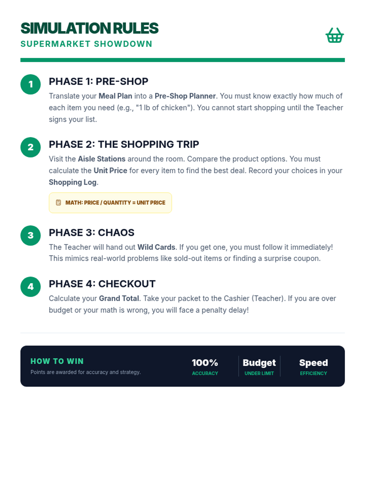A high-energy, in-class simulation where students apply their knowledge of meal planning, unit pricing, and grocery store layout to navigate a 'Supermarket Showdown'.