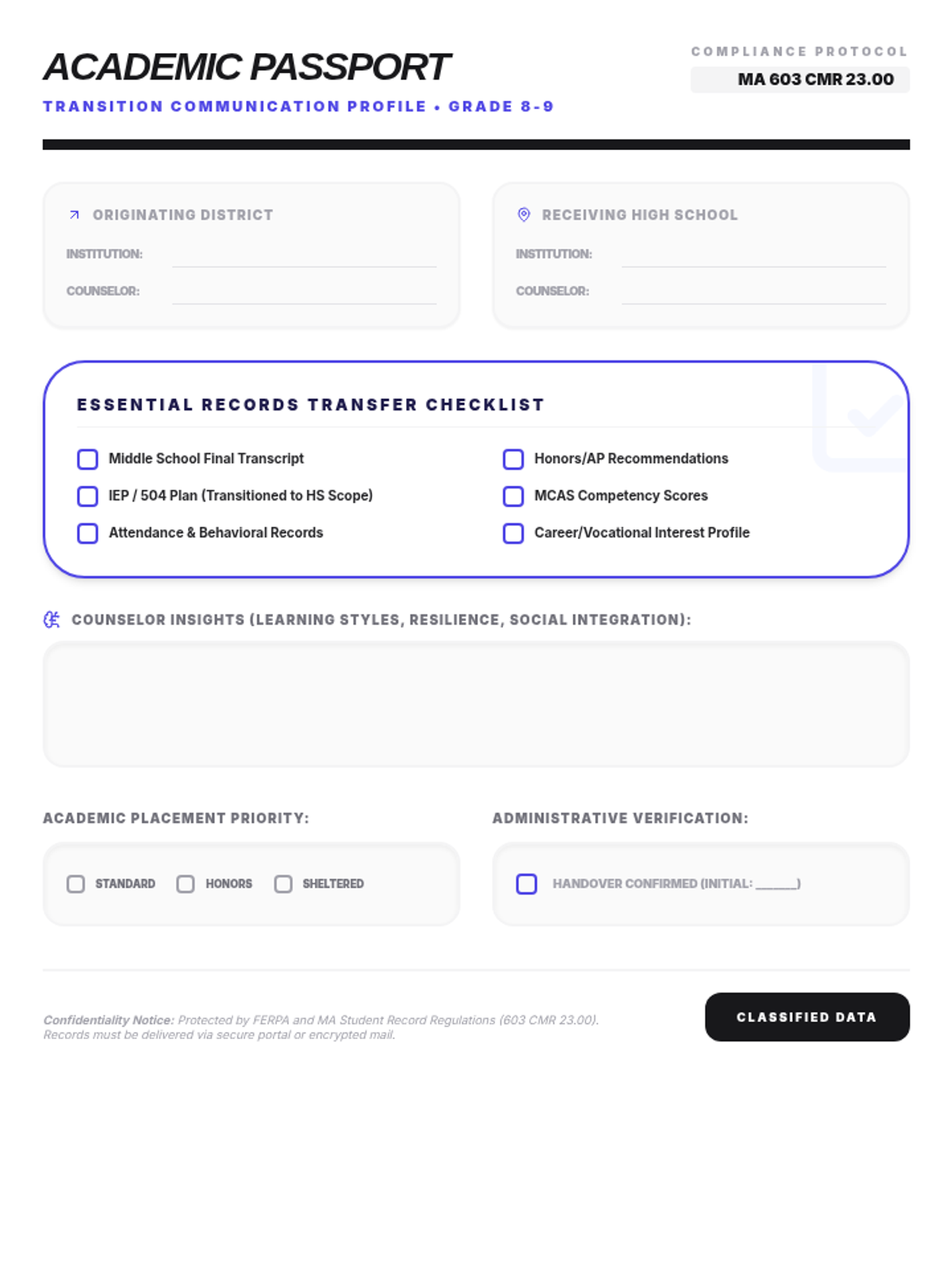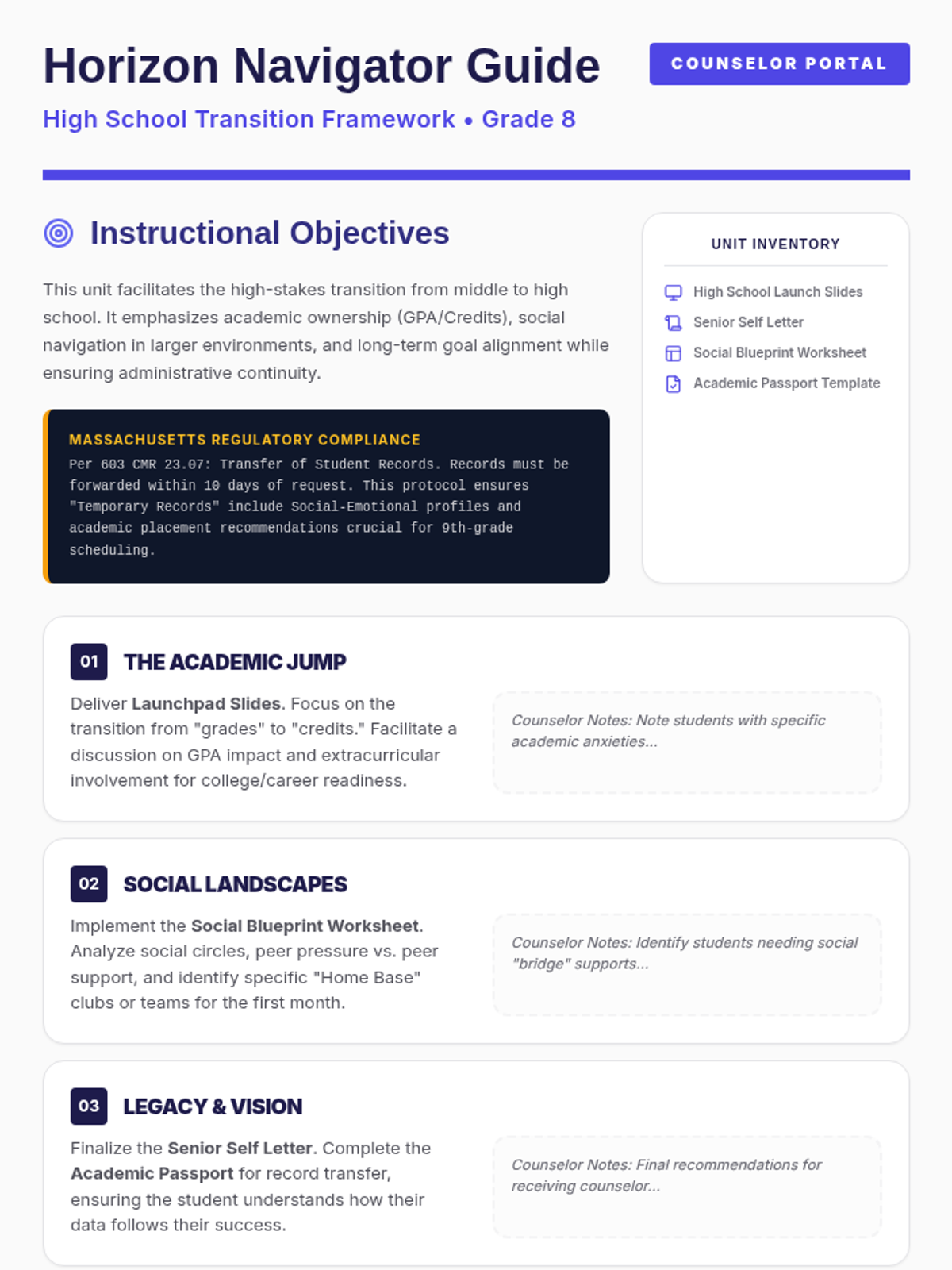 A specialized counseling unit for 8th-grade students transitioning to high school. Focuses on academic accountability, social-emotional independence, and administrative coordination for high-stakes school transitions.