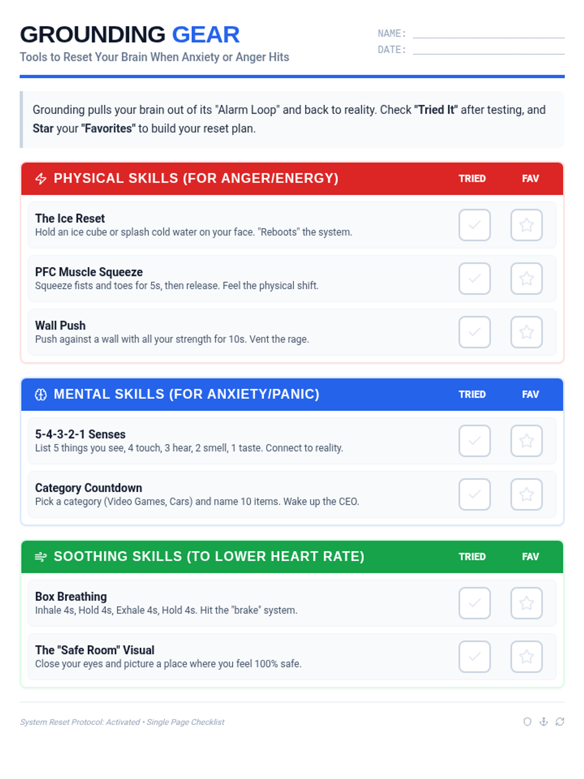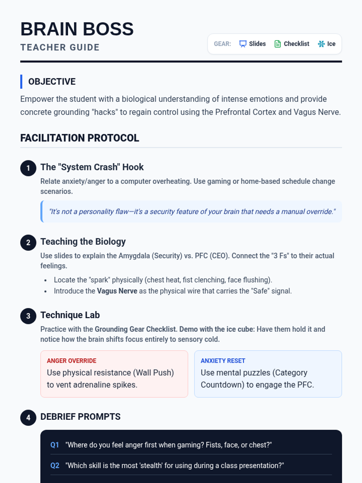 A lesson for middle schoolers on the neuroscience of grounding, covering the amygdala, prefrontal cortex, and vagus nerve to manage anxiety and anger.