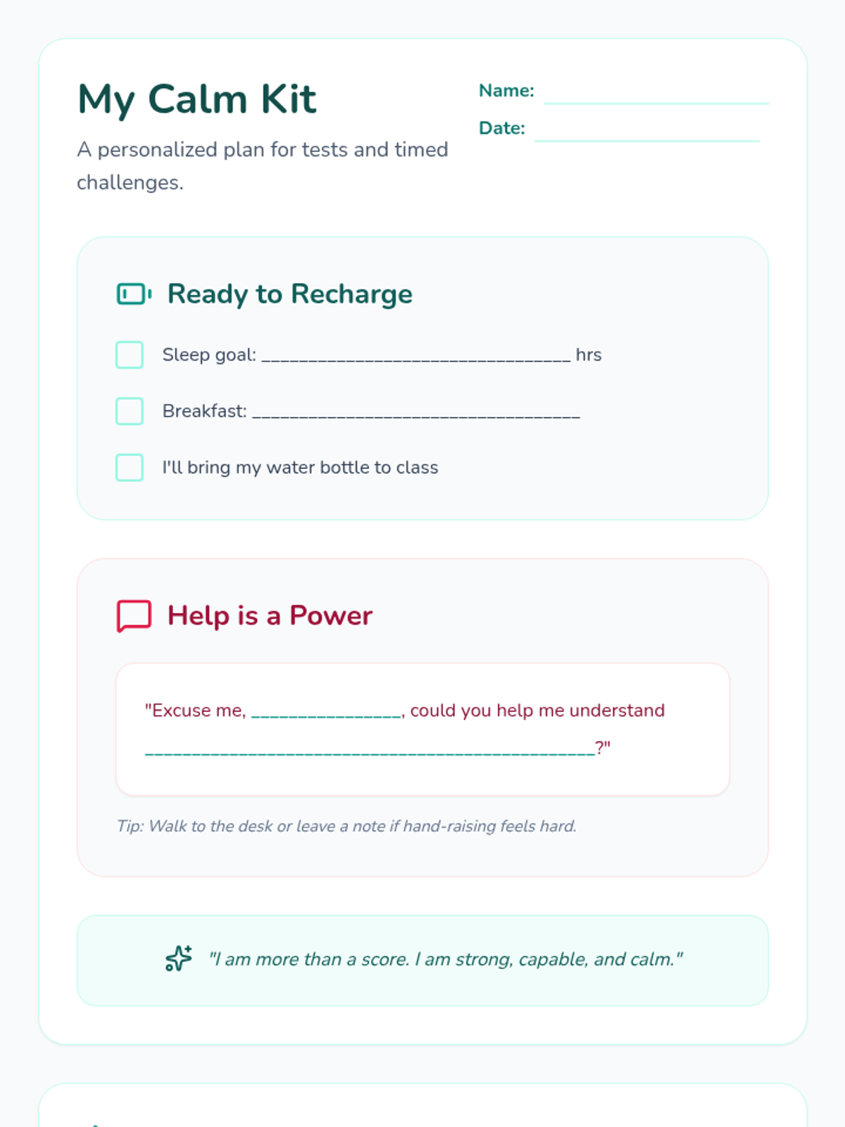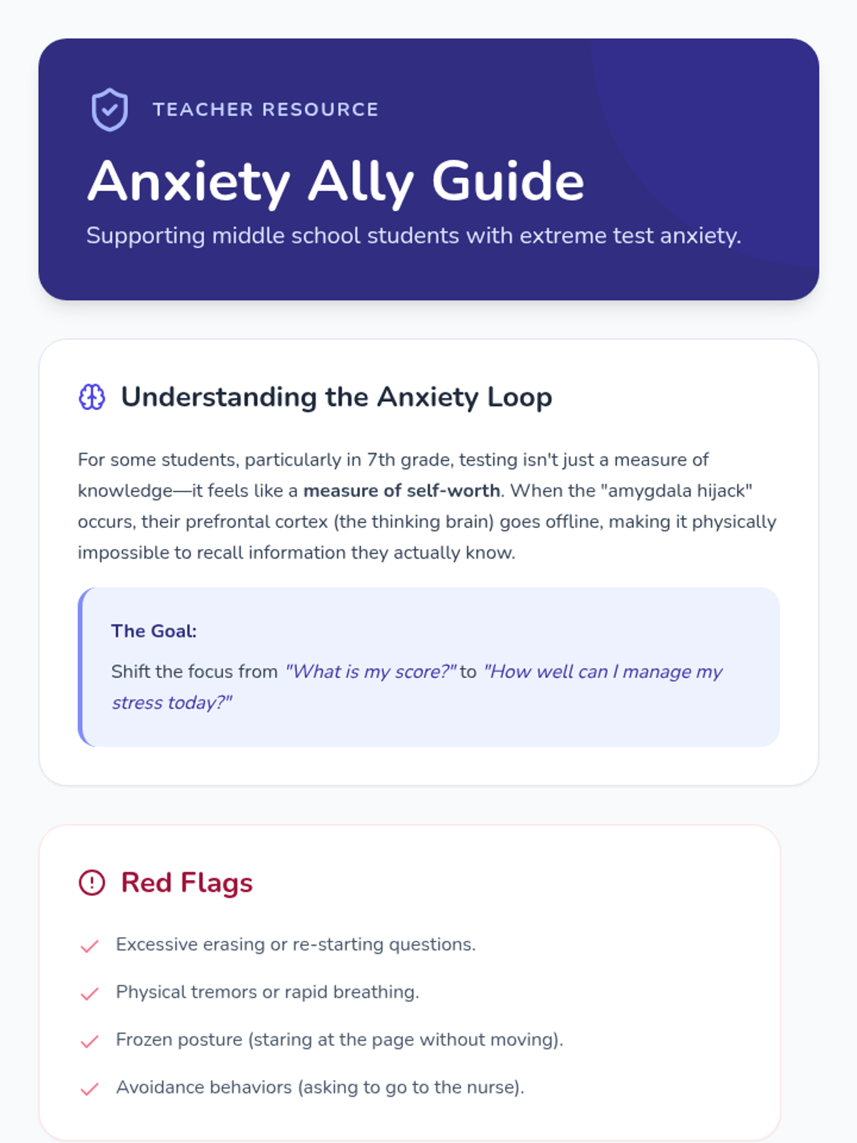 A comprehensive lesson designed to help middle school students, particularly those with high anxiety, navigate test stress with calming strategies and physical wellness.