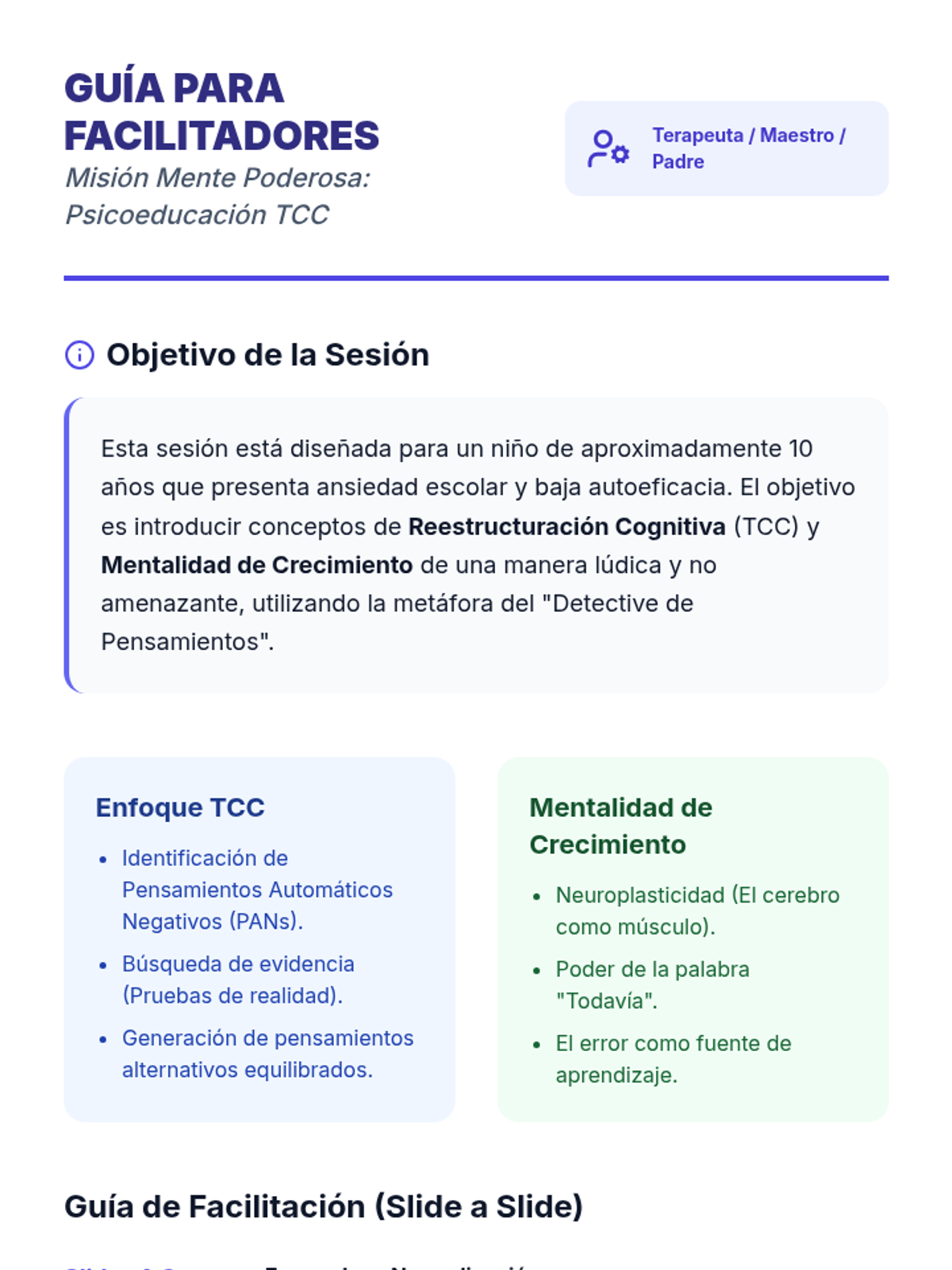 Una lección de psicoeducación basada en TCC y mentalidad de crecimiento diseñada para niños de 10 años, enfocada en desafiar pensamientos negativos y aumentar la confianza escolar.
