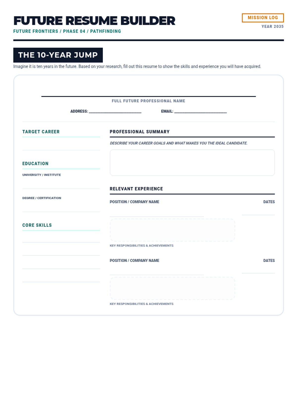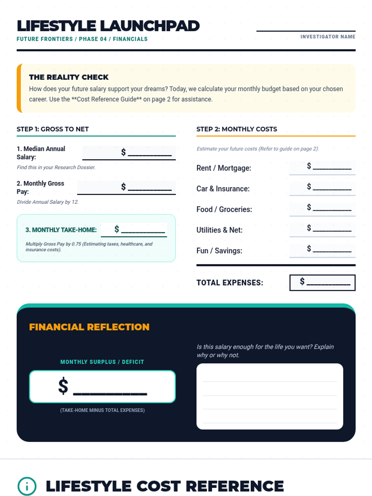 Students explore the practicalities of their chosen career, including budgeting based on salary and drafting a future resume.