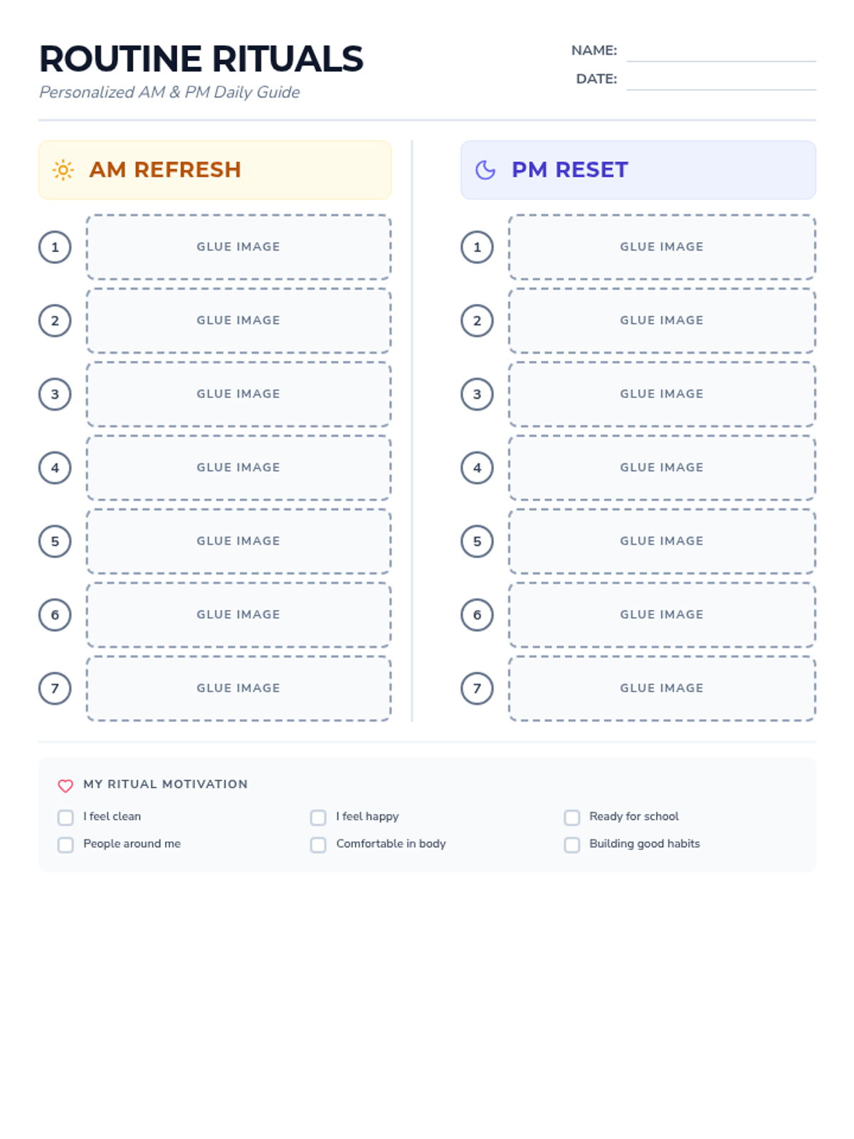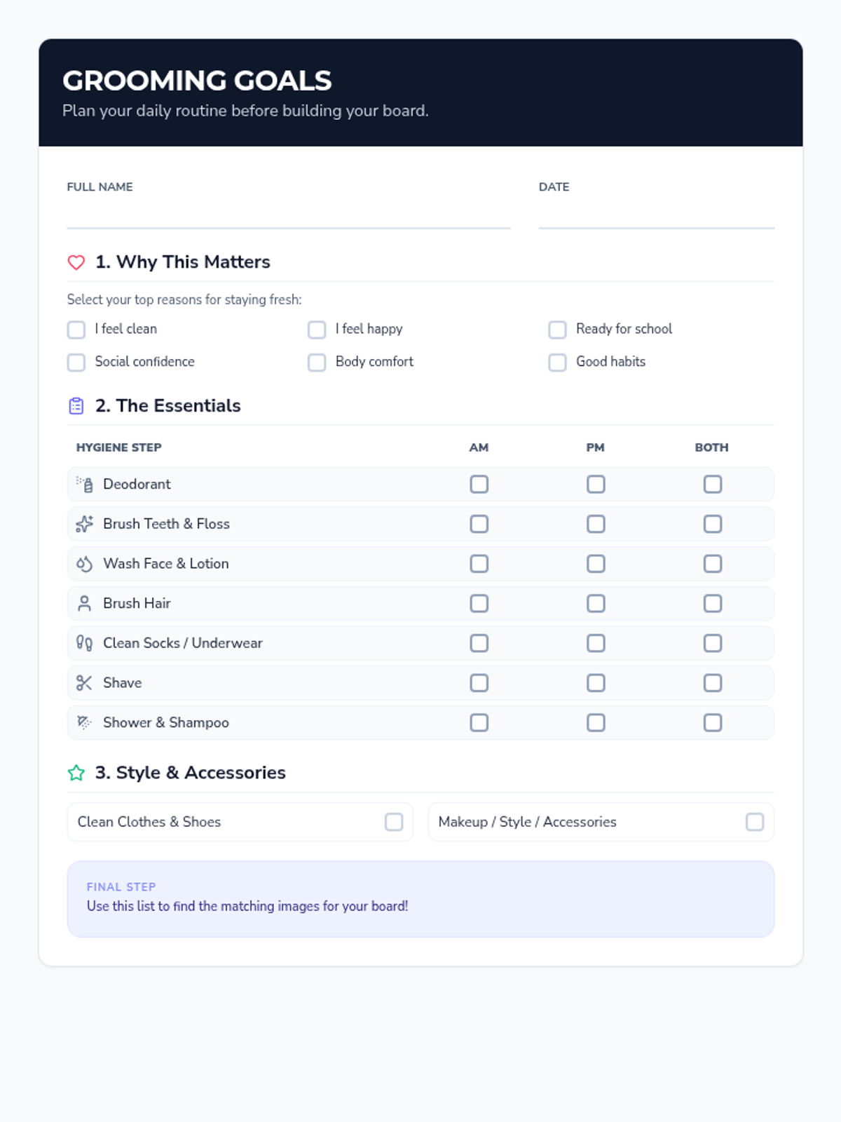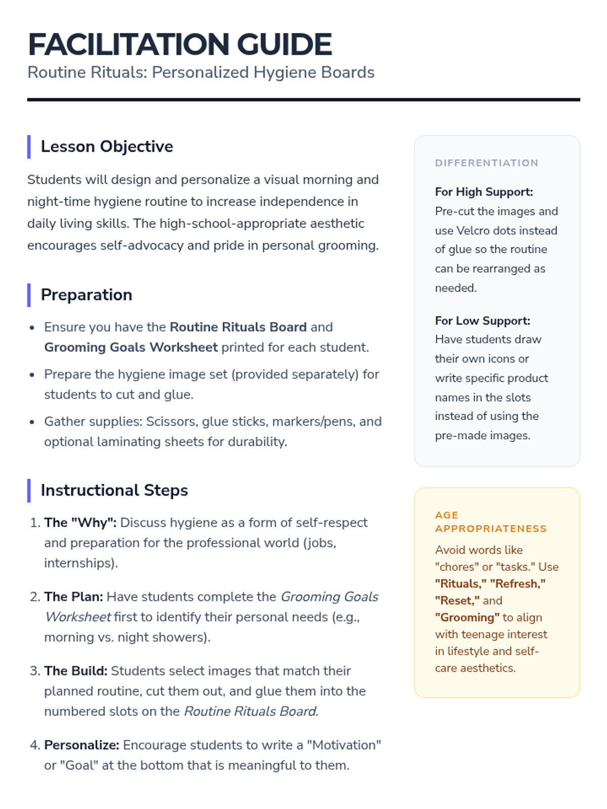 A life skills lesson designed for high schoolers to create personalized, age-appropriate morning and night hygiene routines using a visual checklist format. Students plan their steps and customize a template for daily use.