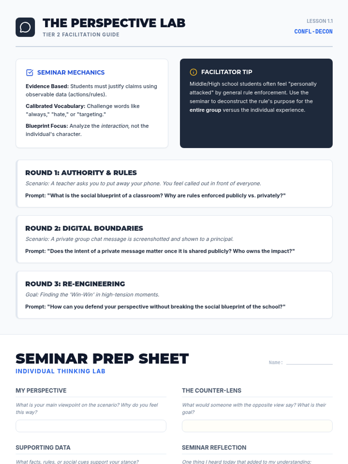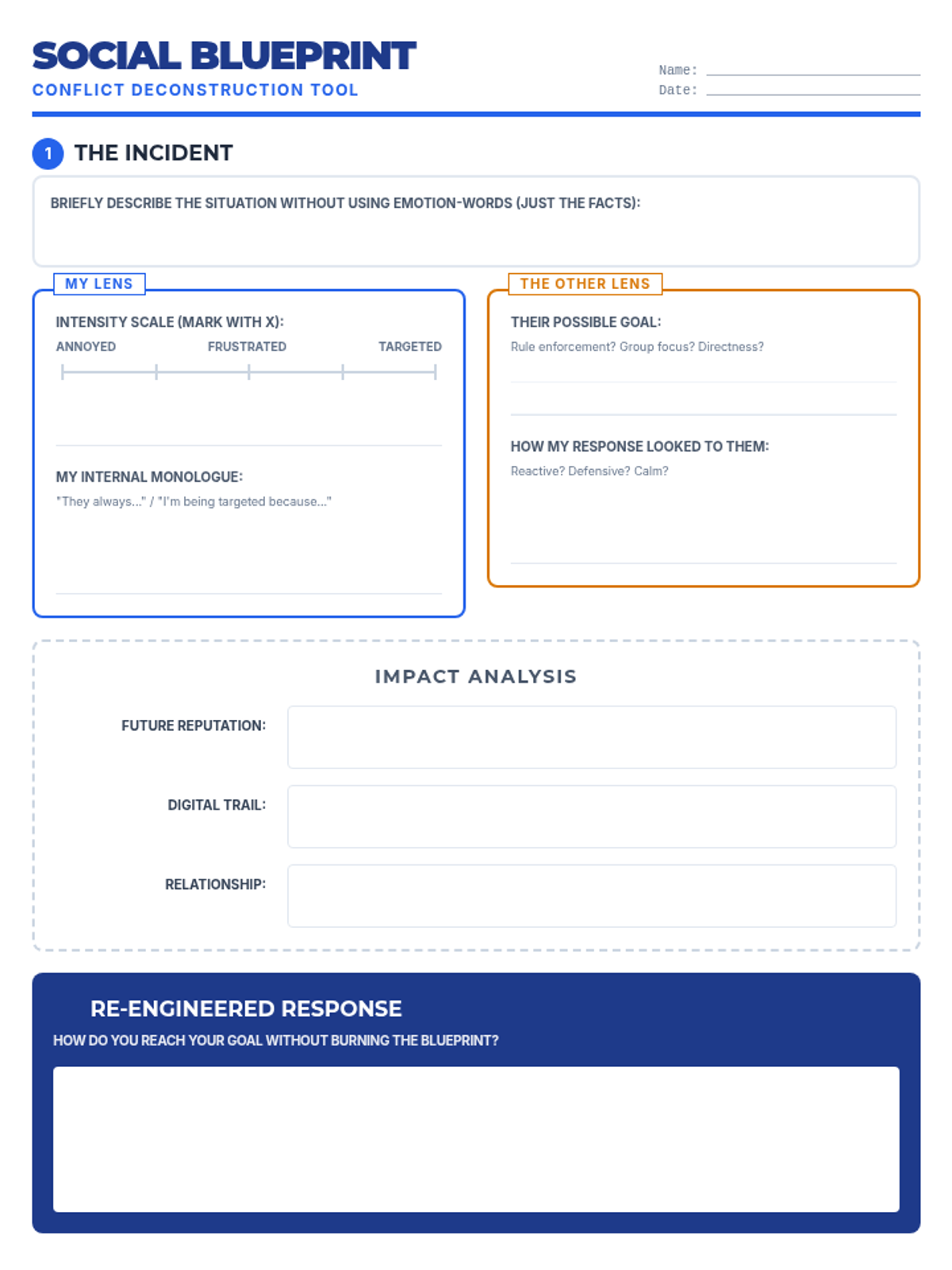 Focuses on deconstructing personal conflicts through multiple lenses, specifically addressing the gap between personal feelings and external impact in school and peer environments.