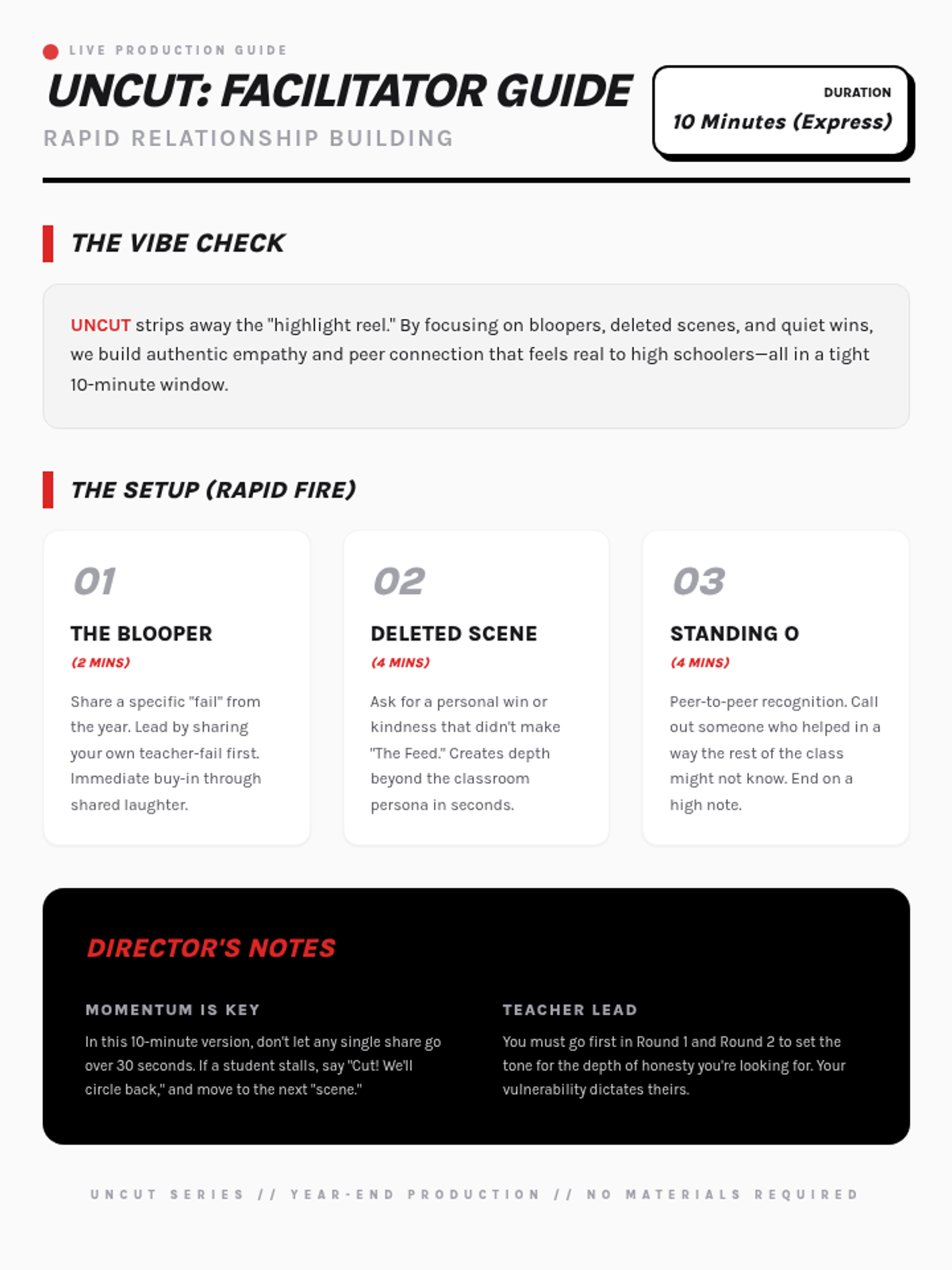 A high-authenticity, zero-material icebreaker that encourages high school students to share 'behind-the-scenes' moments from the year to build empathy and peer connection.