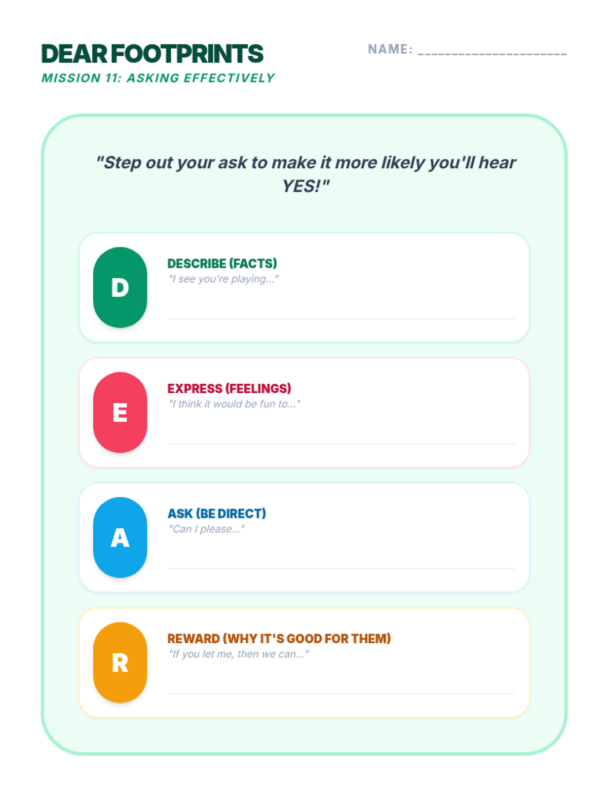 Using the DEAR mnemonic to effectively ask for what is needed while maintaining relationships.