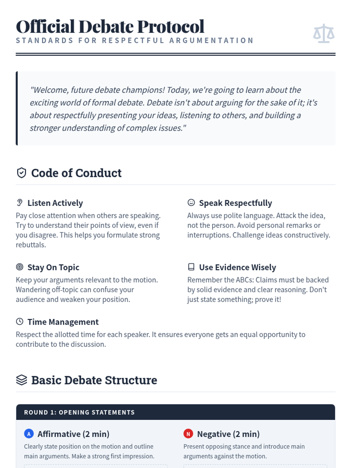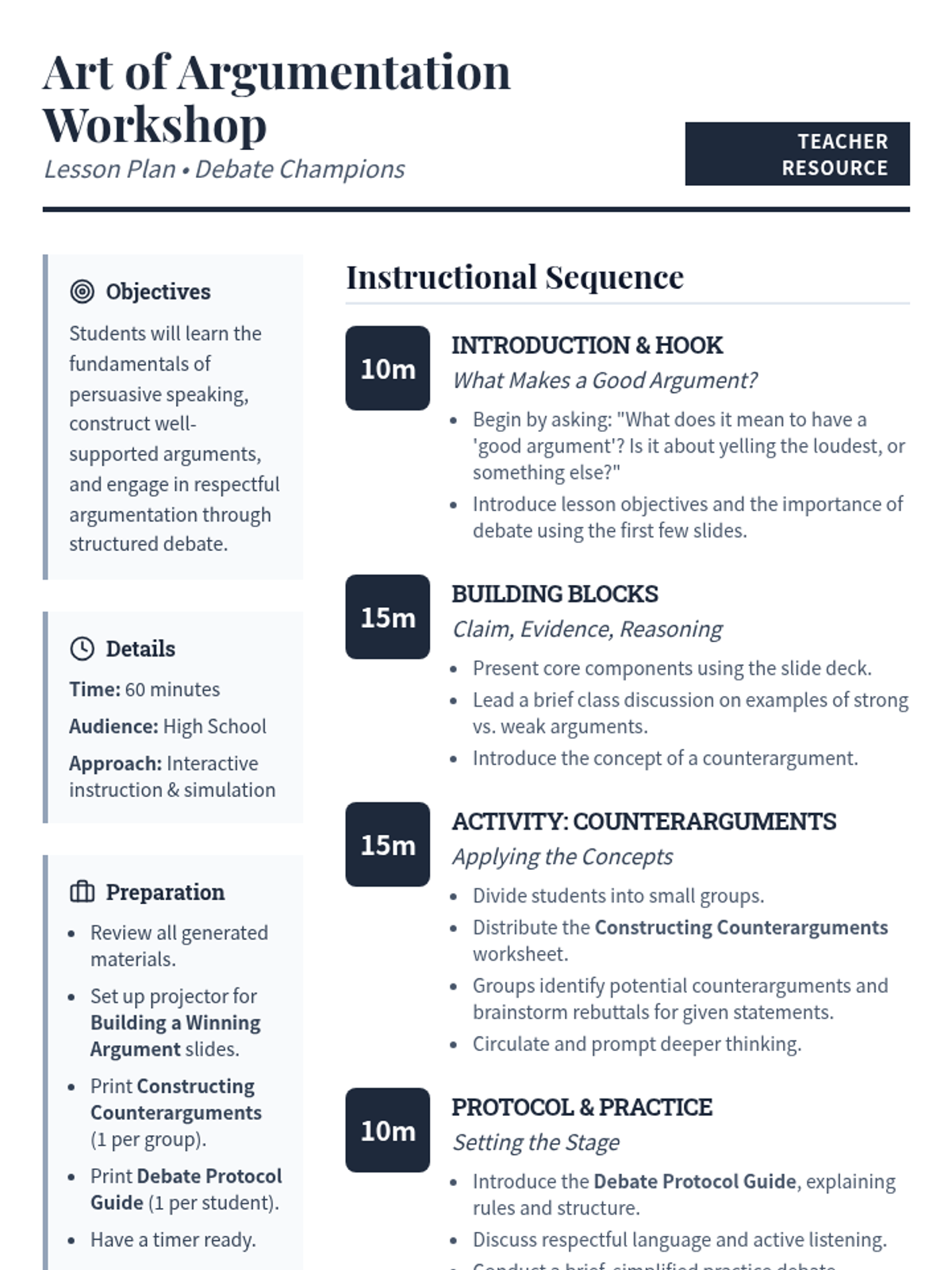 This lesson equips high school students with persuasive speaking and respectful argumentation skills through structured debates, focusing on claim, evidence, and reasoning.