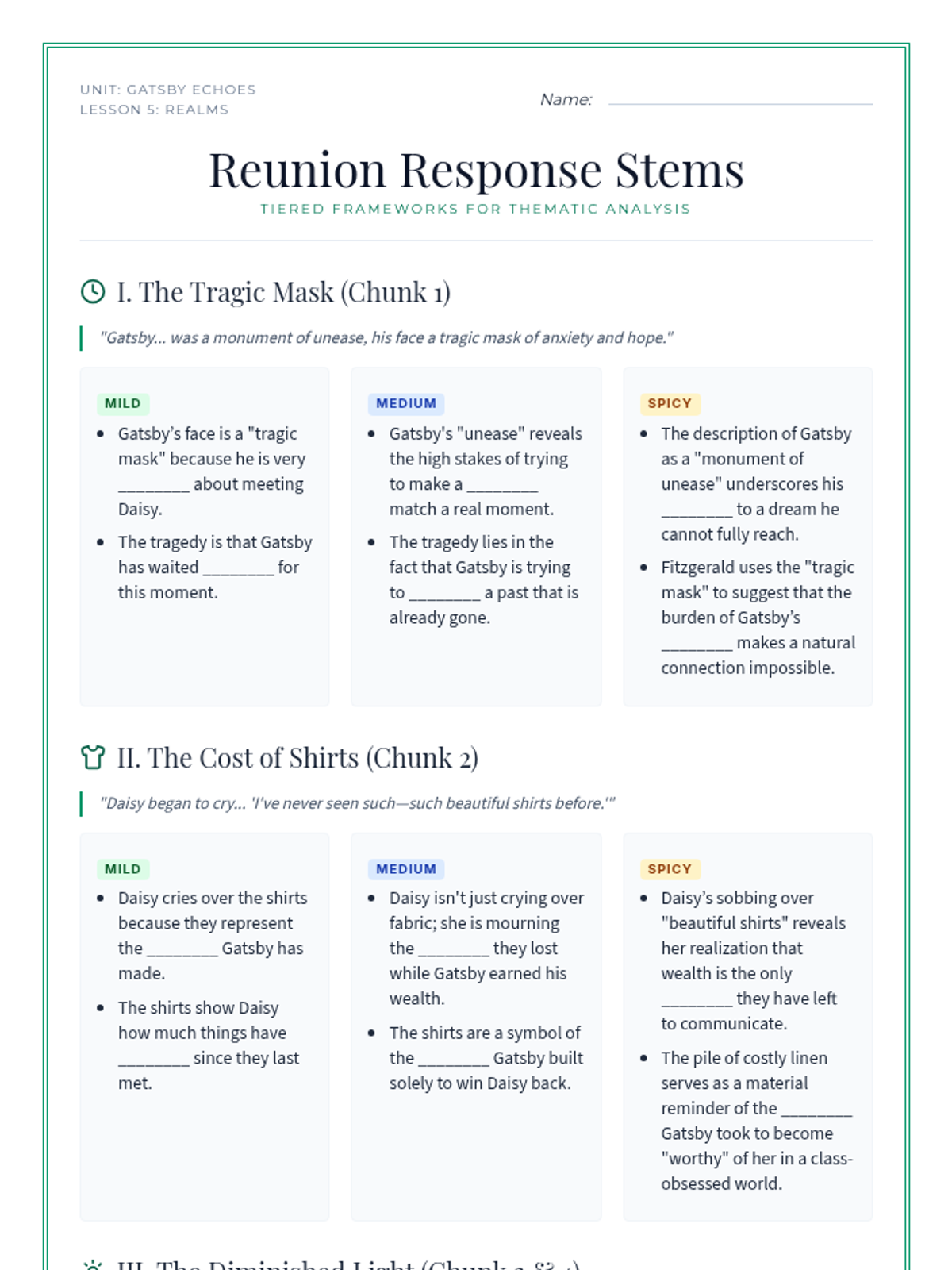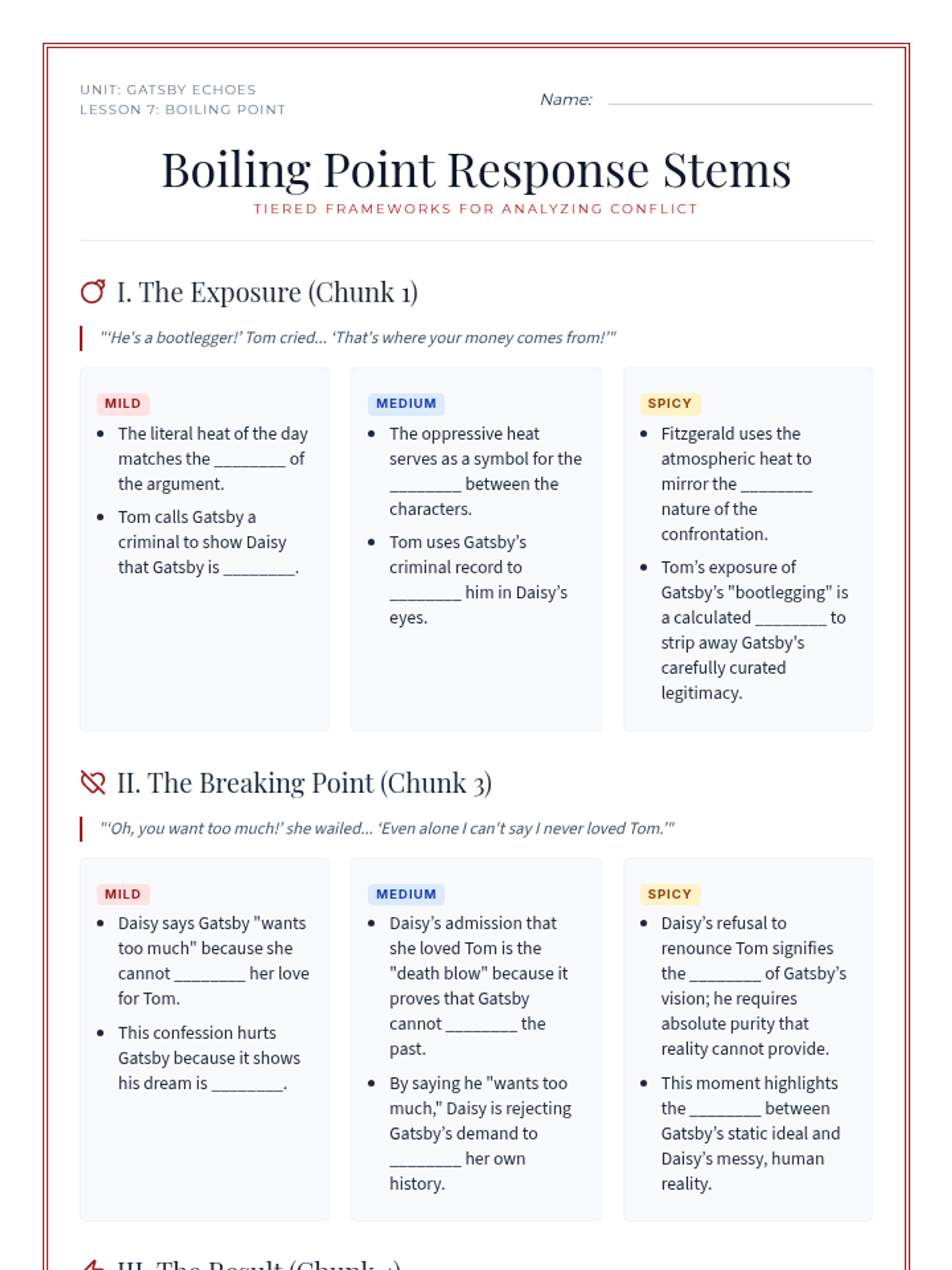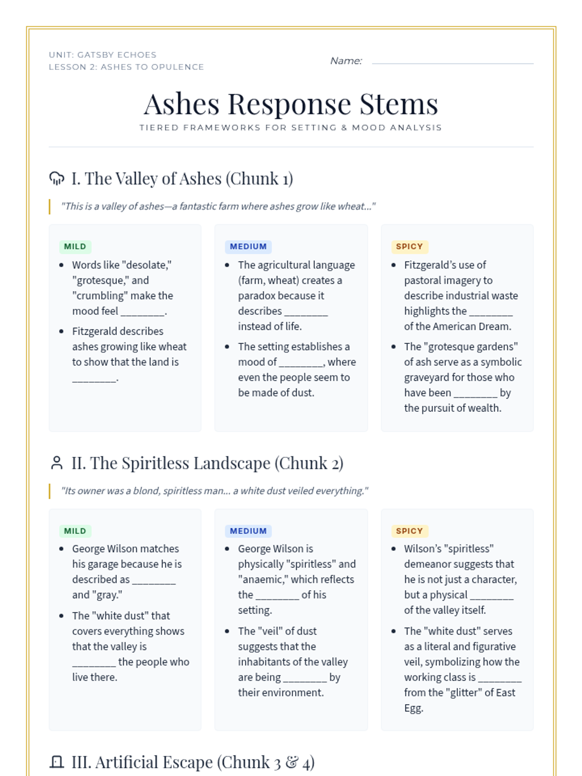 An exploration of the contrasting settings in Chapter 2, specifically the Valley of Ashes and Myrtle Wilson's apartment. Students analyze how setting contributes to mood, characterization, and emerging themes of social decay.