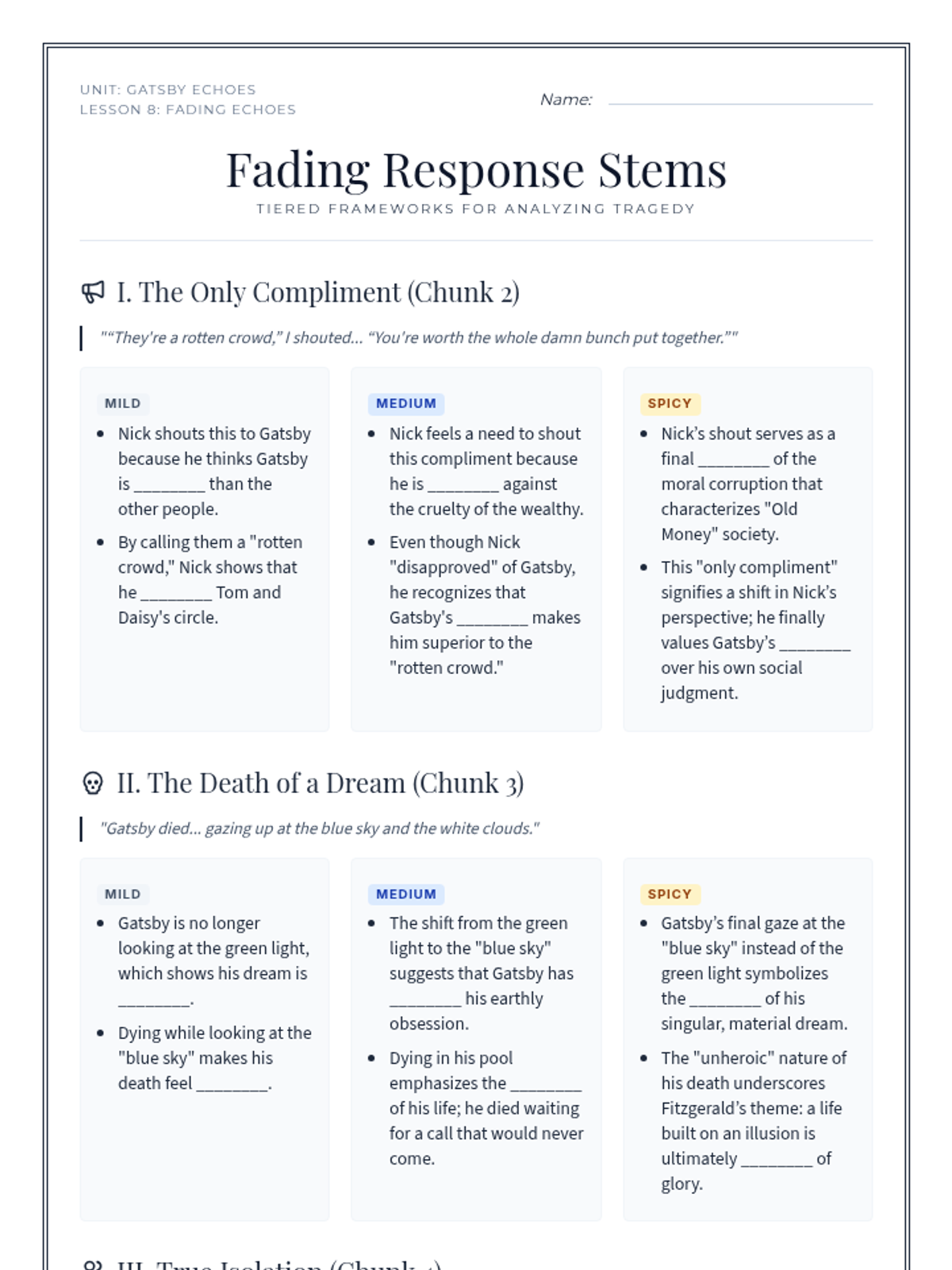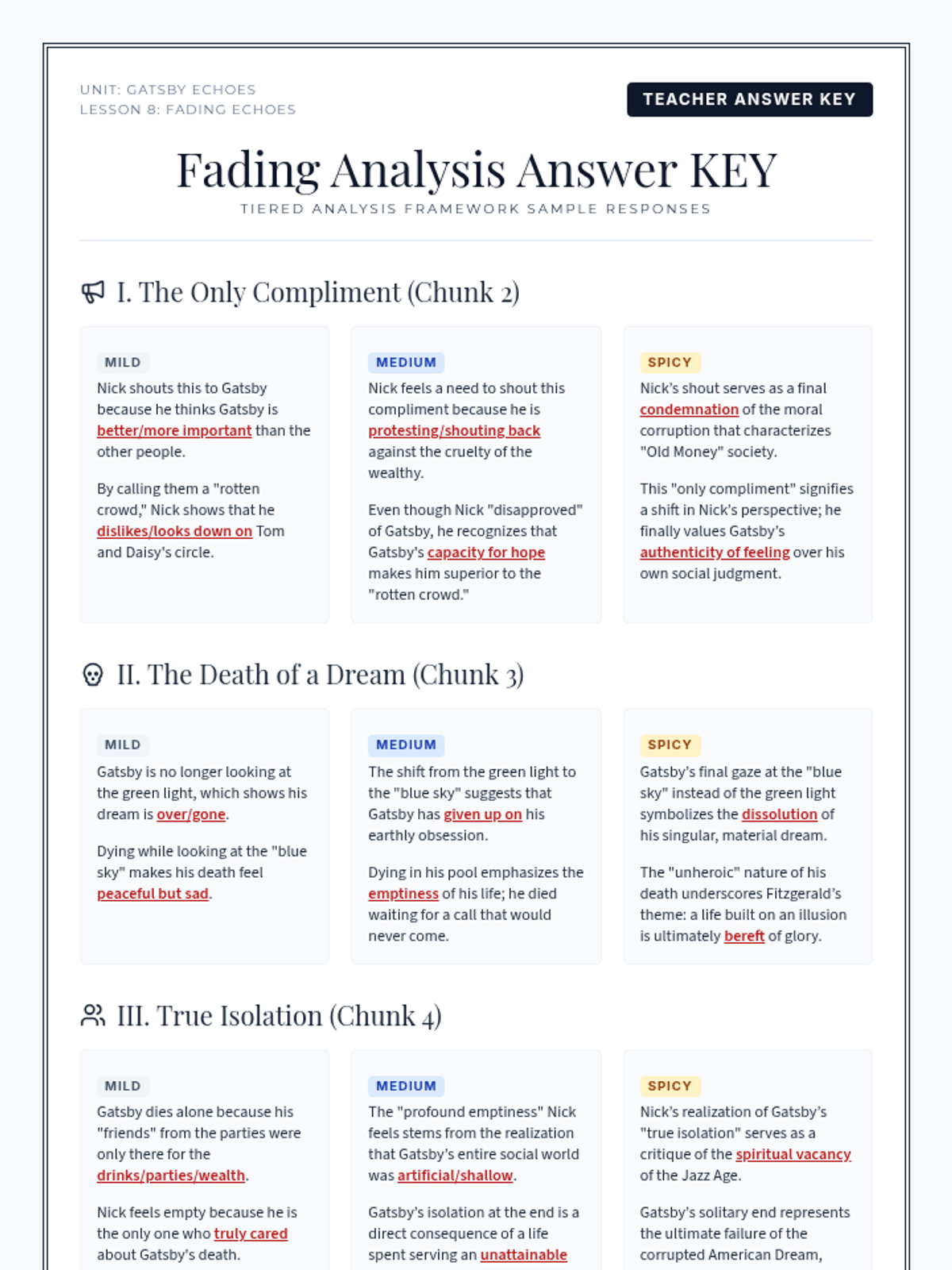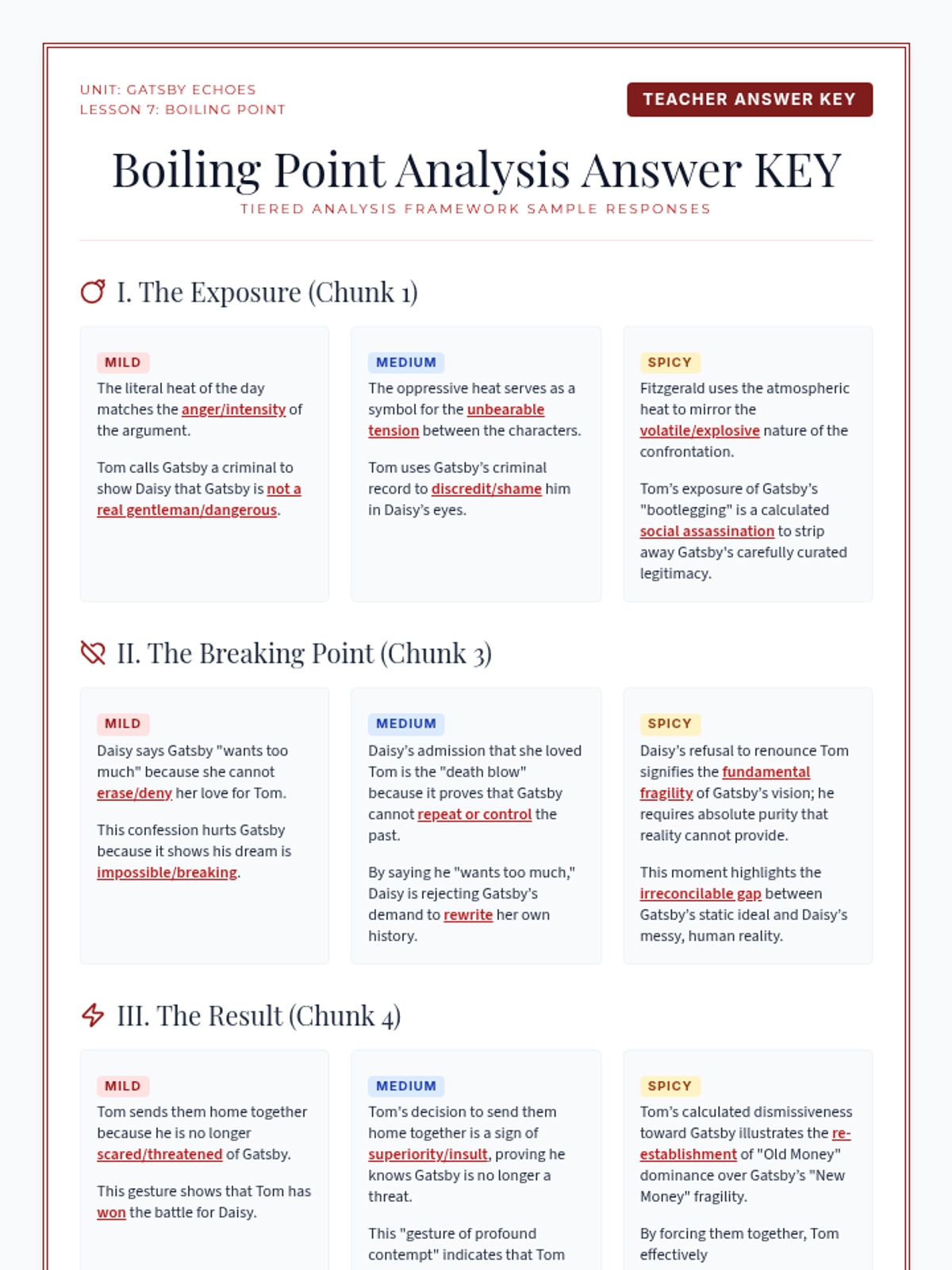 An exploration of the contrasting settings in Chapter 2, specifically the Valley of Ashes and Myrtle Wilson's apartment. Students analyze how setting contributes to mood, characterization, and emerging themes of social decay.