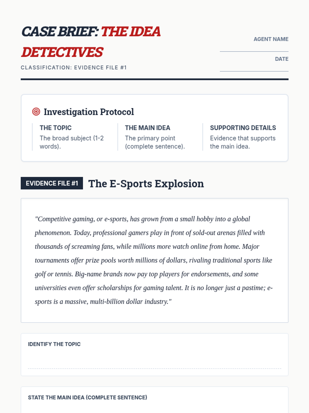 A focused lesson on identifying the topic, main idea, and supporting details in short informational texts, designed for 6th-grade students.